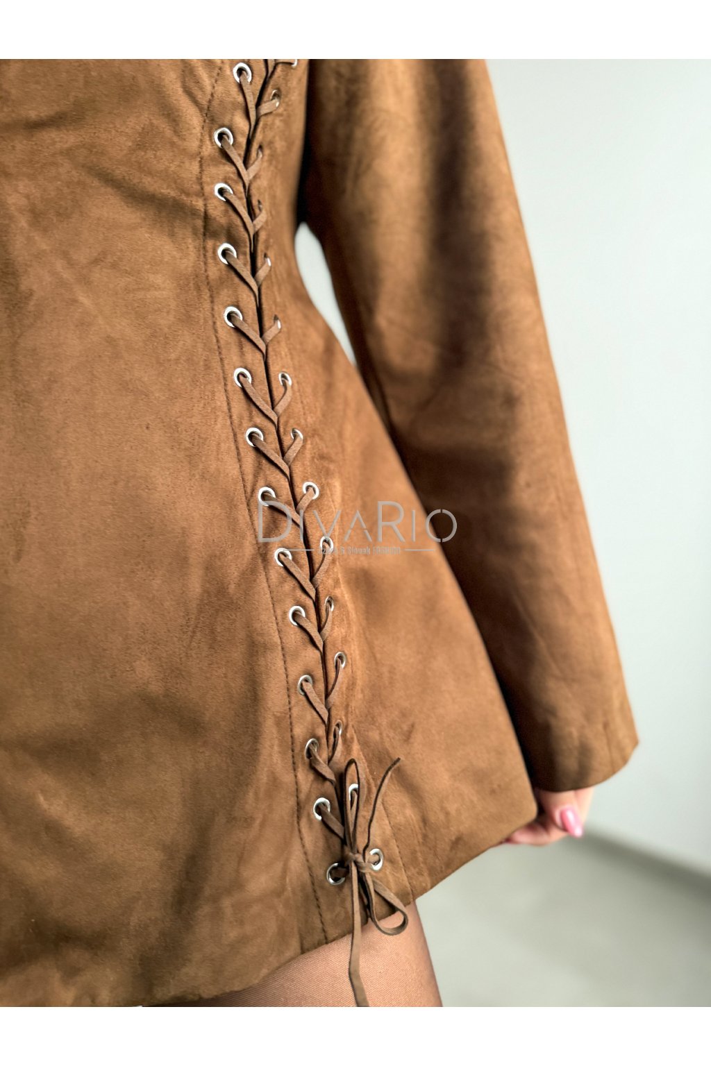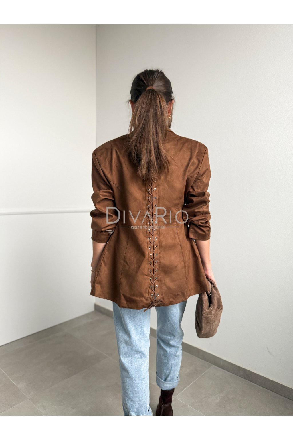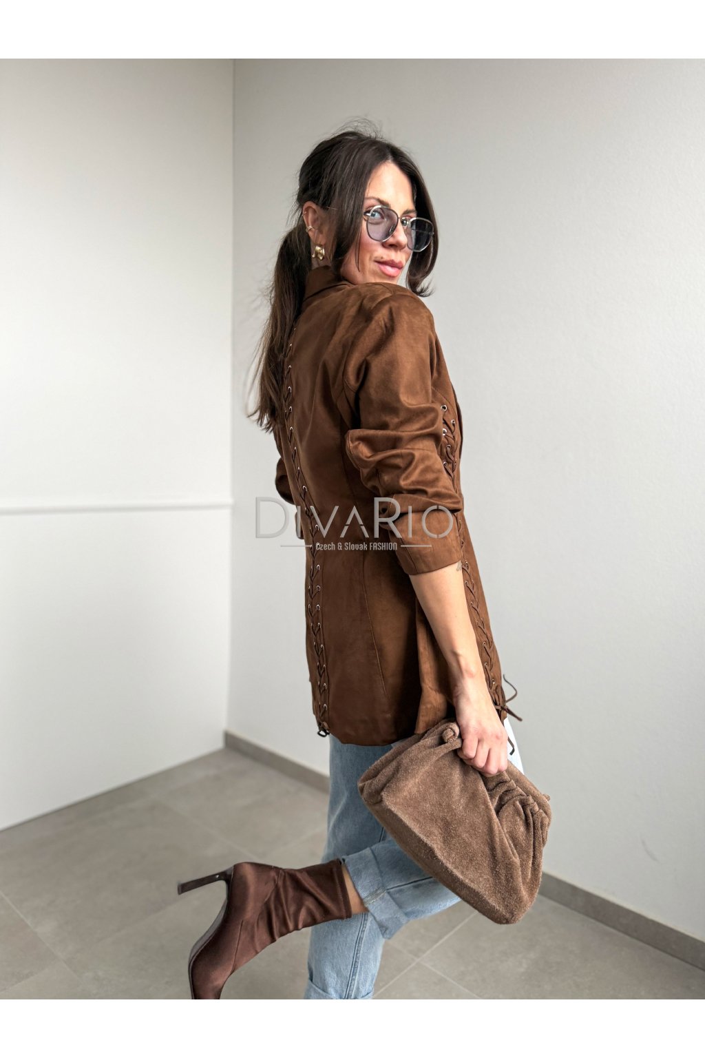 Predĺžené hnedé sako s efektom brúsenej kože/semišu. Zužovací efekt pasu, podširé, top kvalita. Dlhý rukáv, ozdobné prepletanie. Veľkosť UNi vhodná od Xs po M.