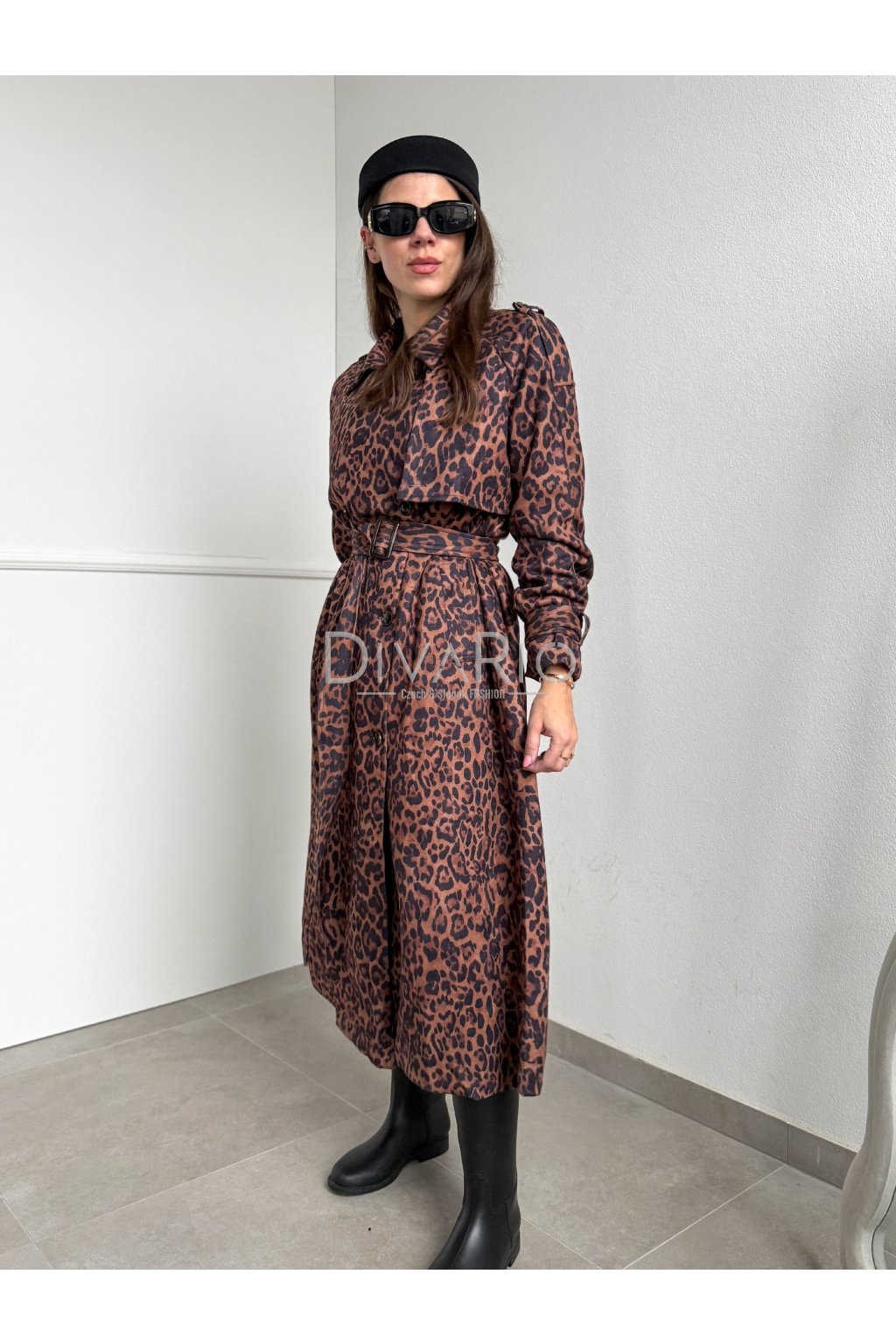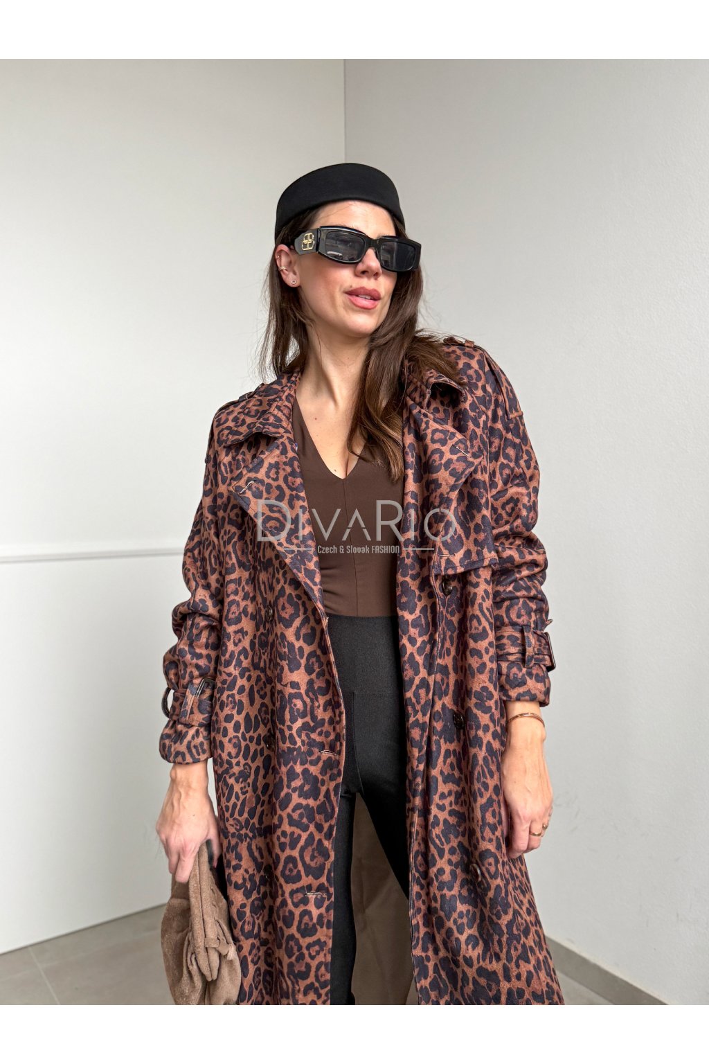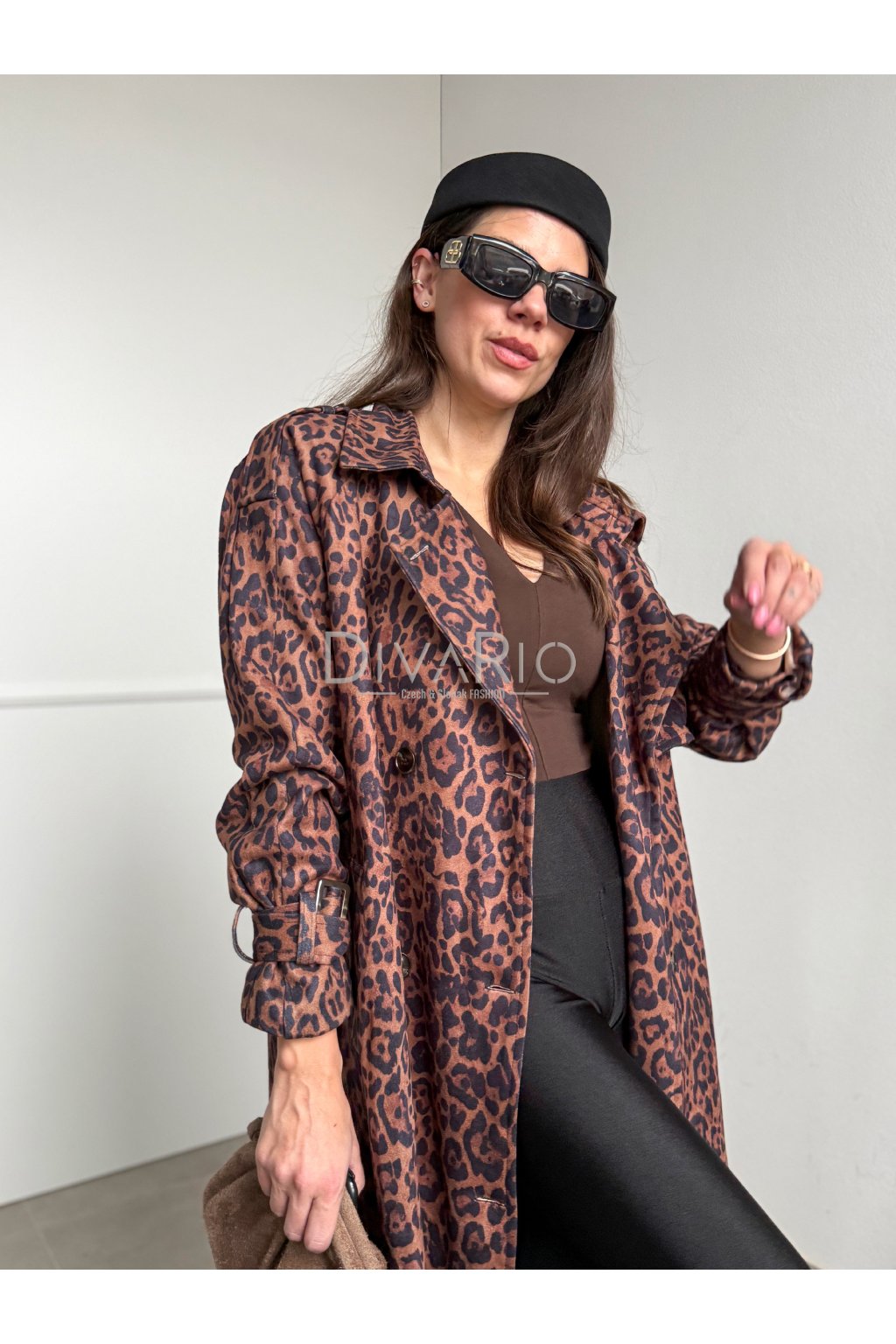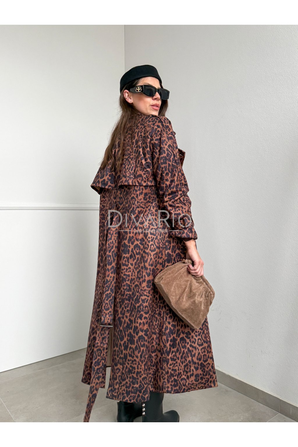 Dlhý suede trenchcoat v leo vzore. Dlhý rukáv, zapínanie na gombíky, opasok súčasťou. Futrovaný.