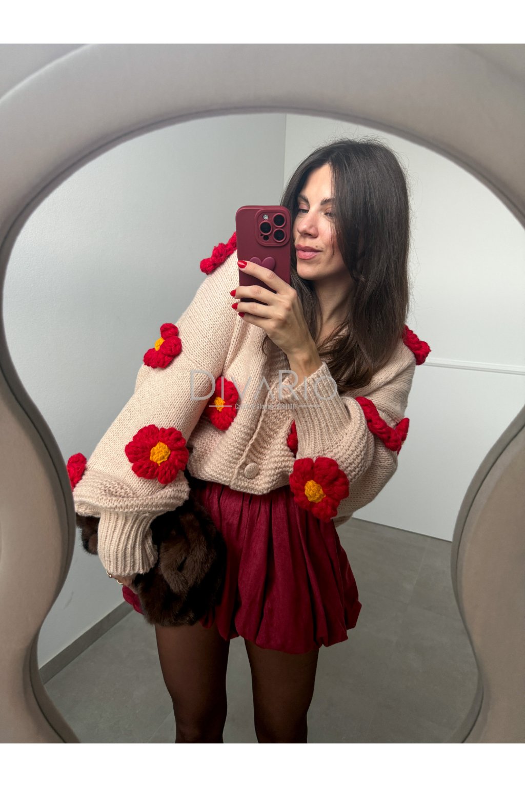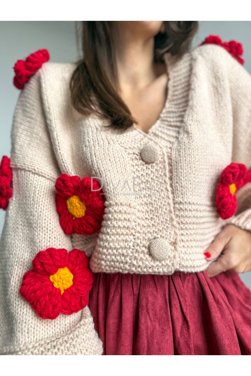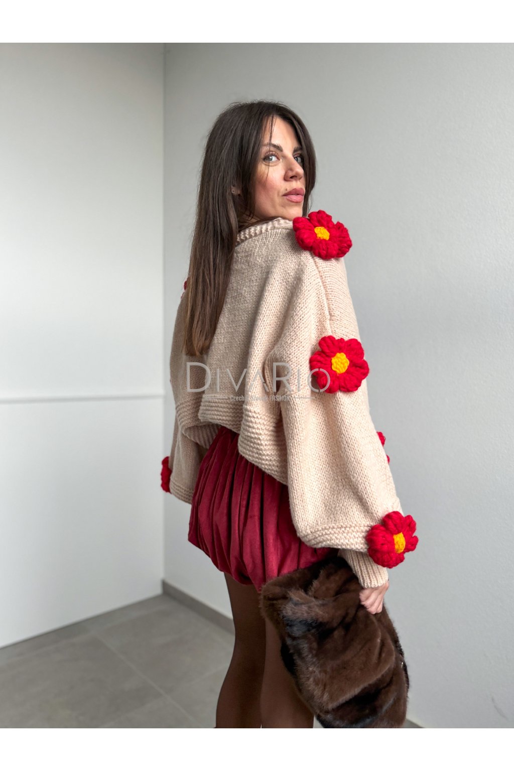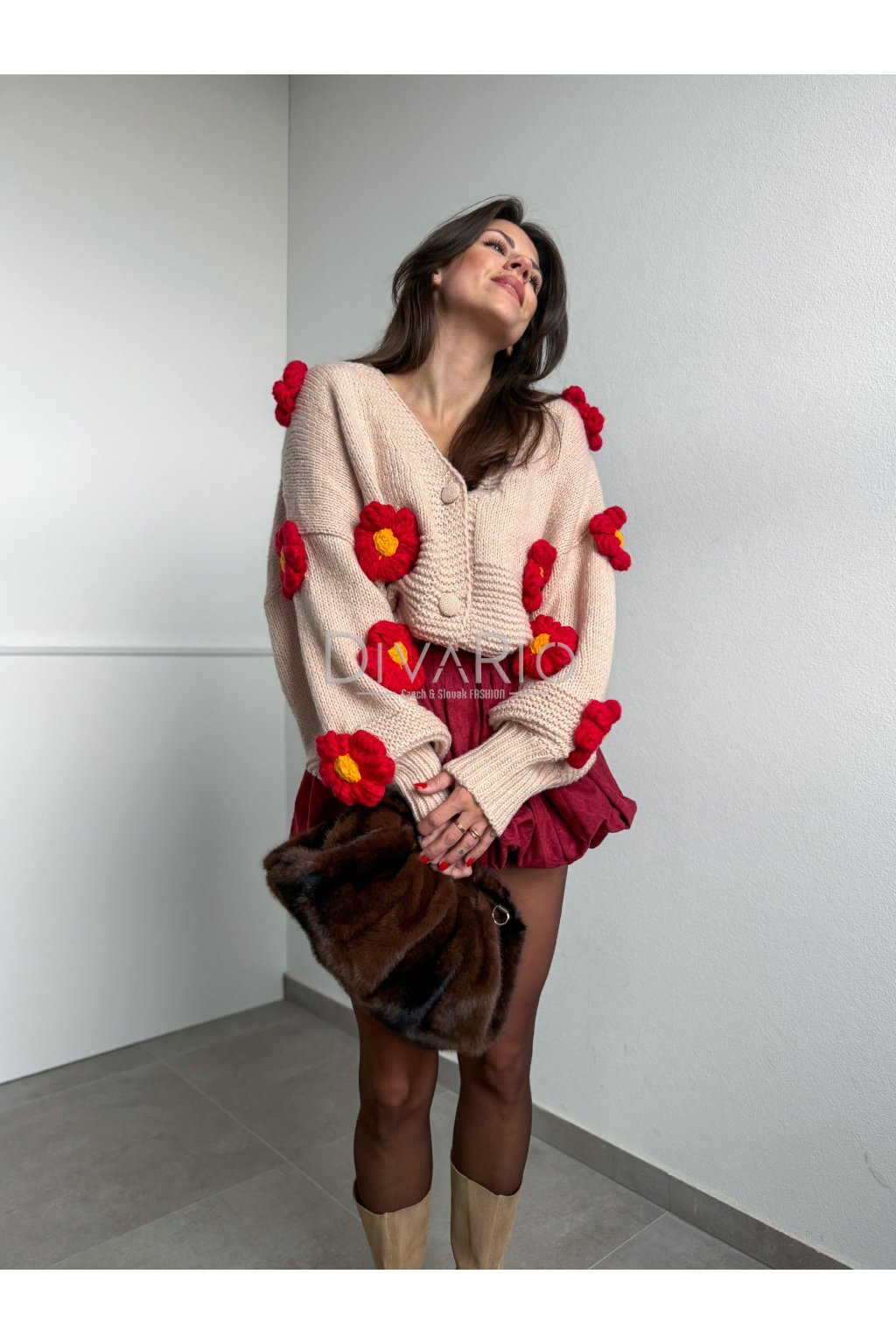 Sveter v bežovej farbe s veľkými 3D červenými kvetinami. Zapínanie na gombíky, dlhý rukáv. oversize strih,