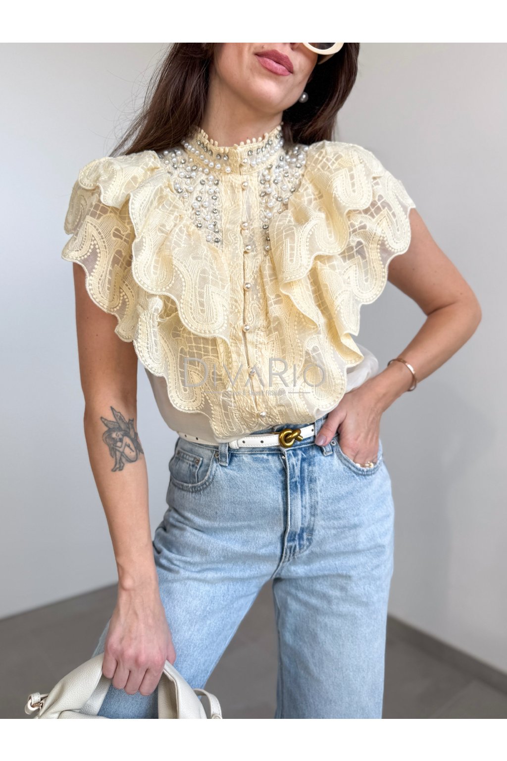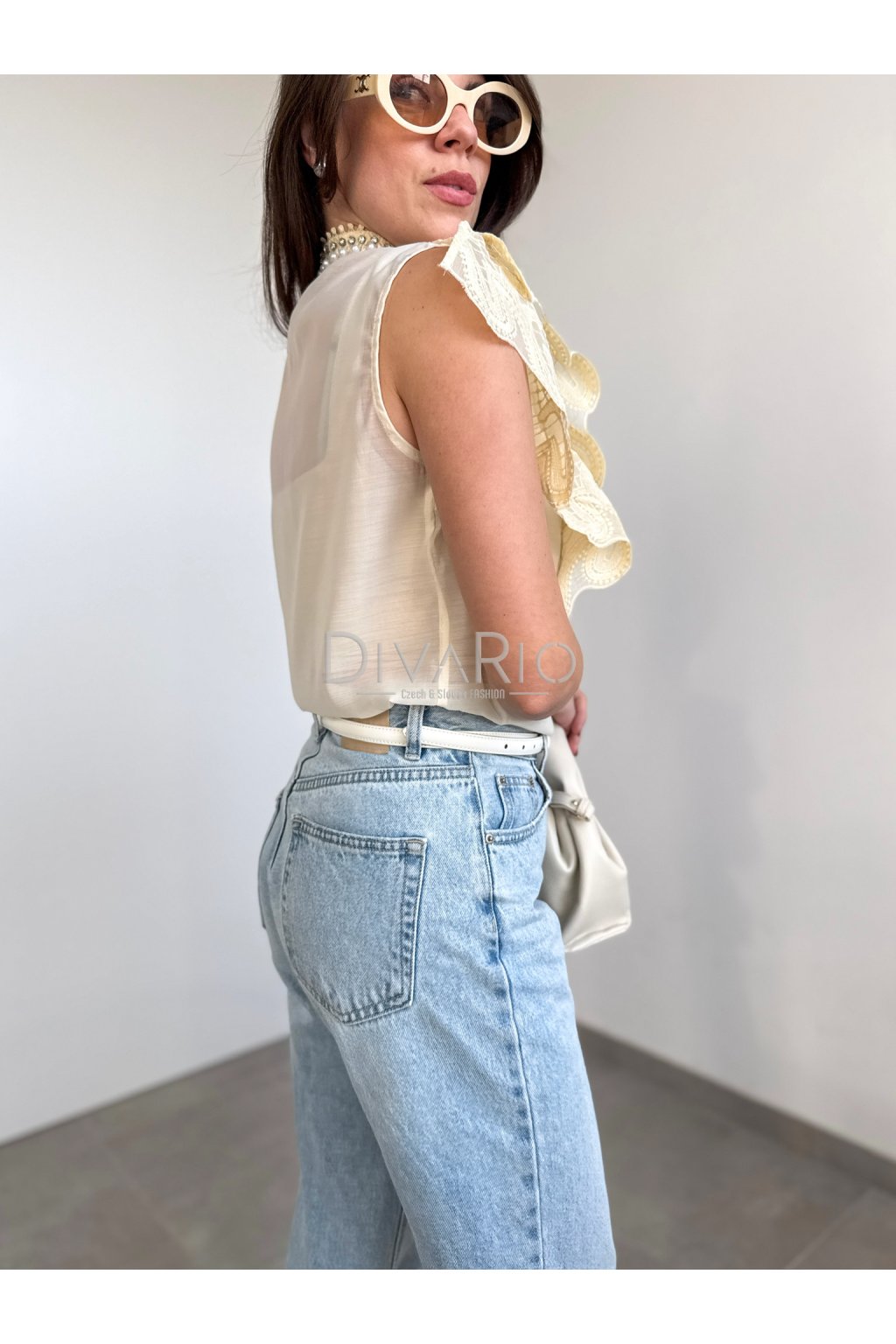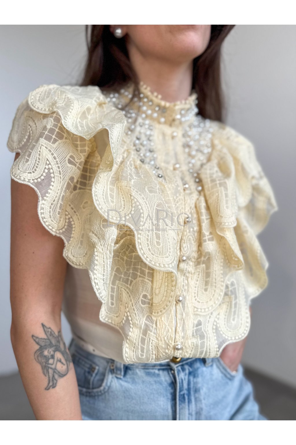 Krémový top bez rukávov s krajkou a perličkami. Zapínanie na gombíky. Zo zadu priesvitné.