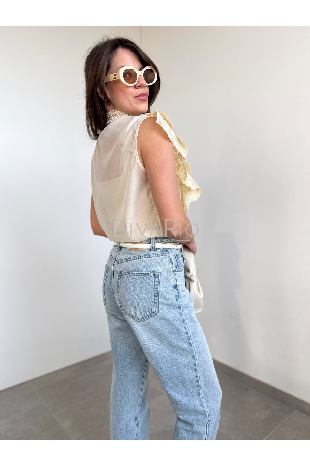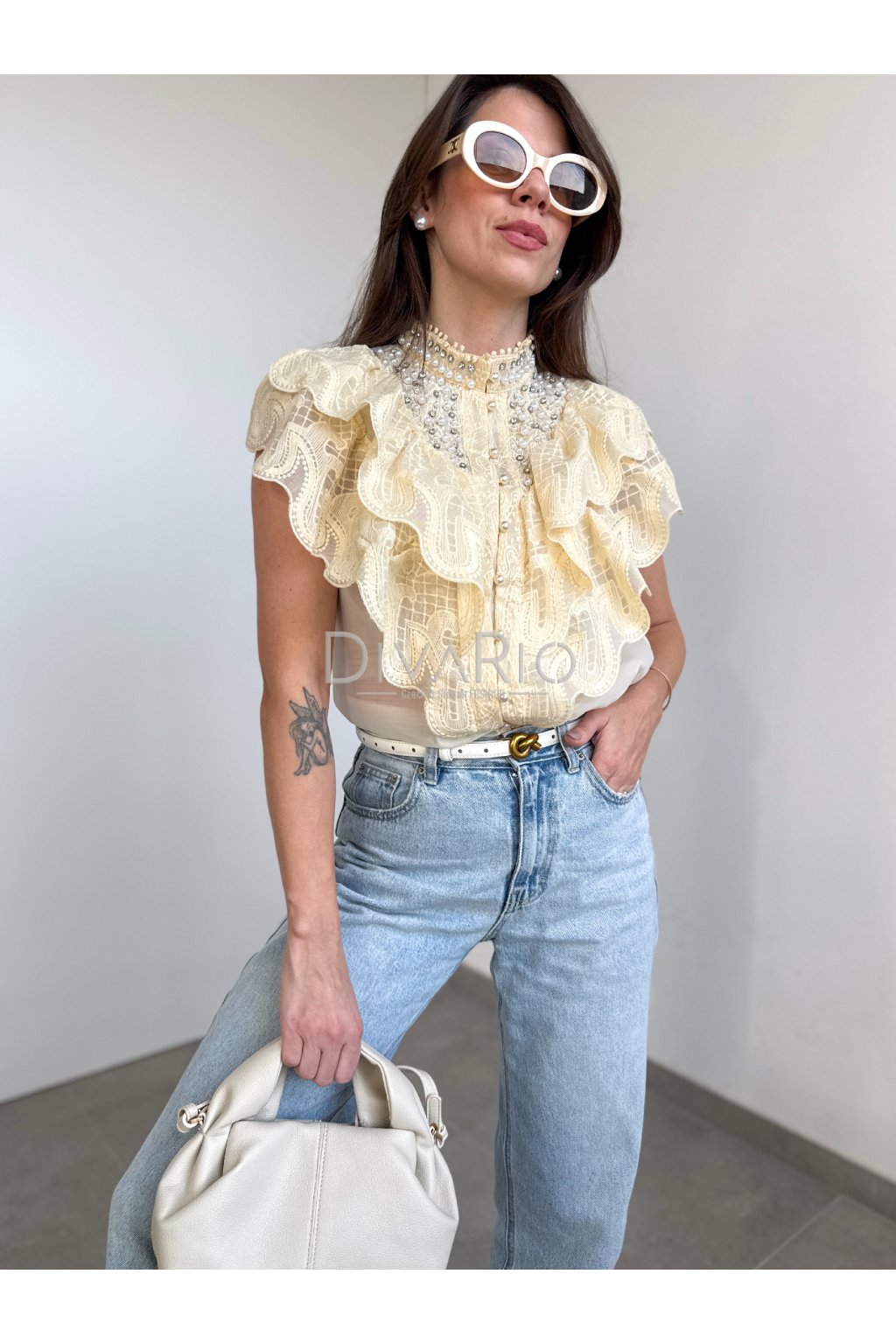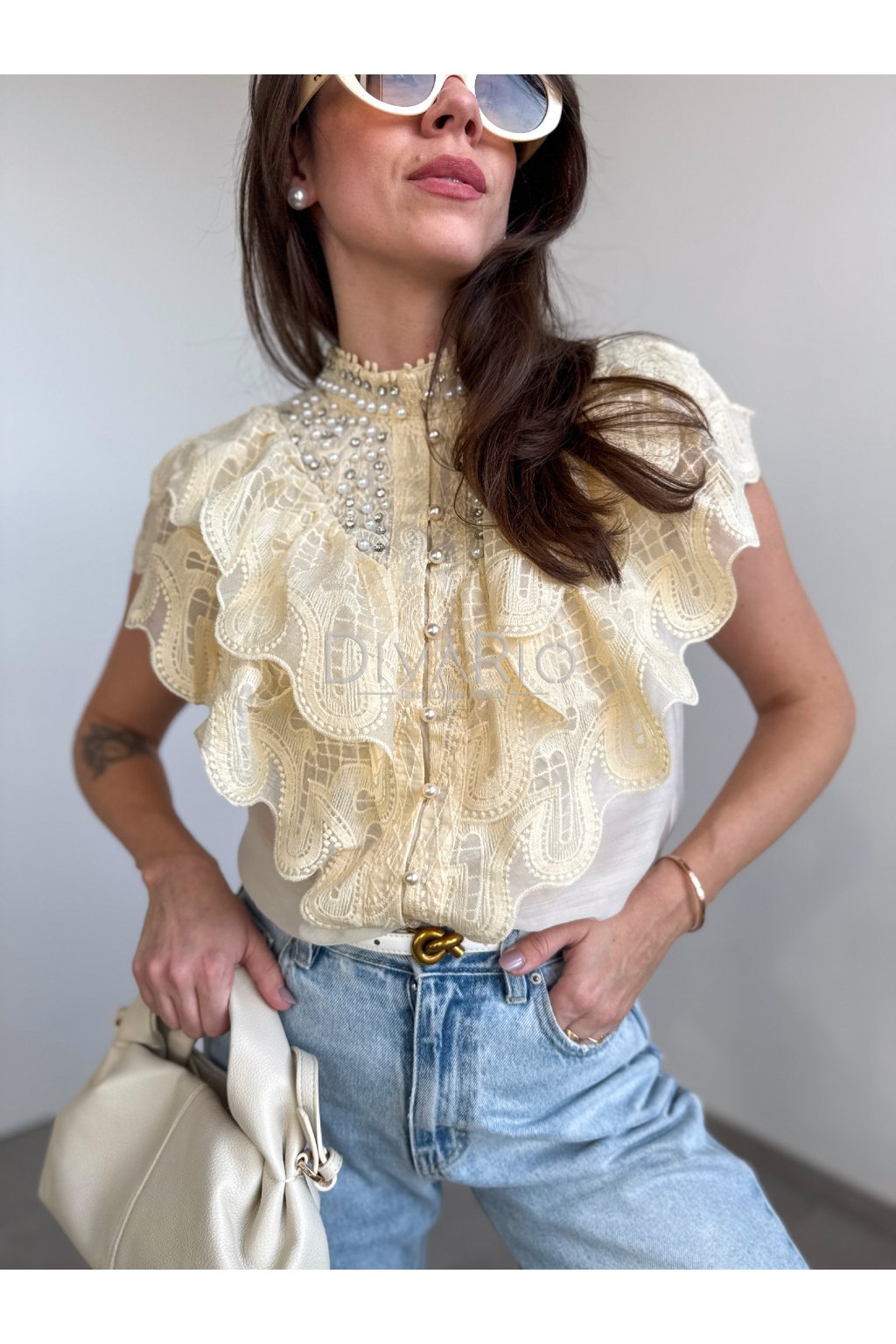 Krémový top bez rukávov s krajkou a perličkami. Zapínanie na gombíky. Zo zadu priesvitné.