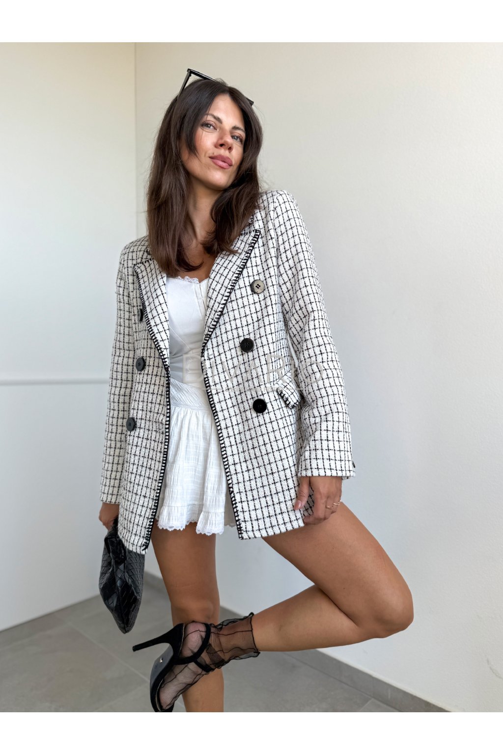 Tvídové sako v bielej farbe, dlhý rukáv, zapínanie na gombíky, top kvalita. Predlžený strih. Podšívka.