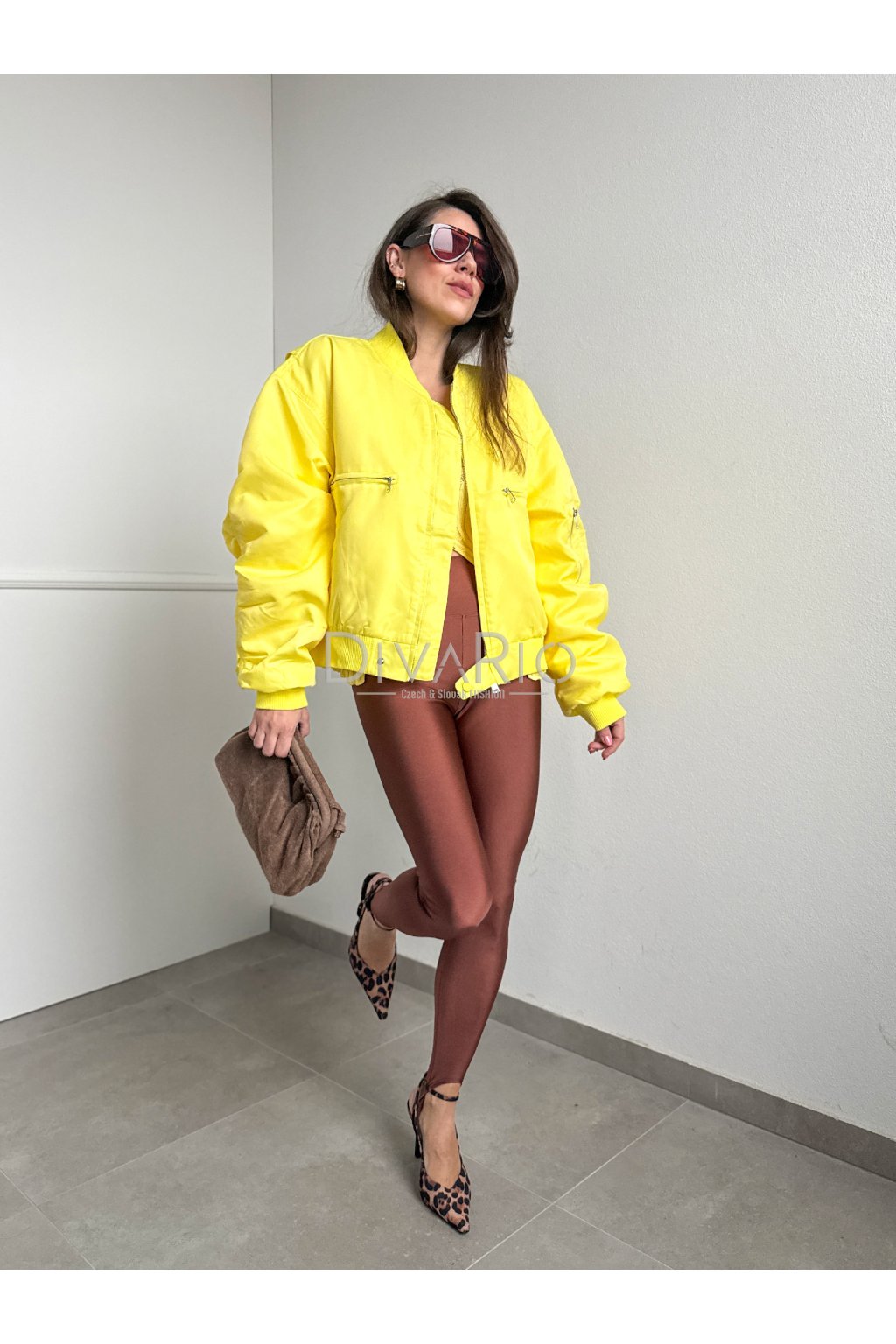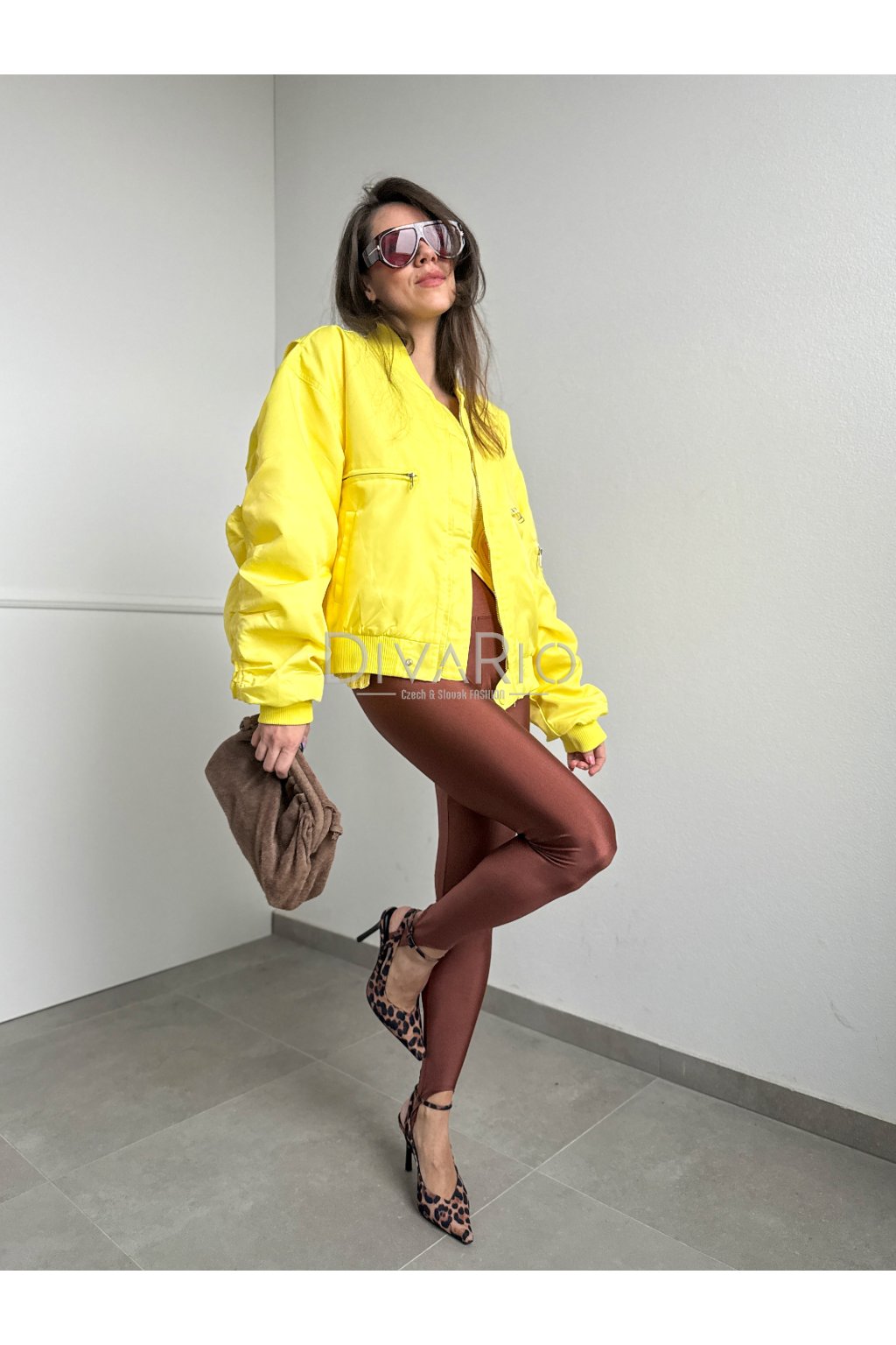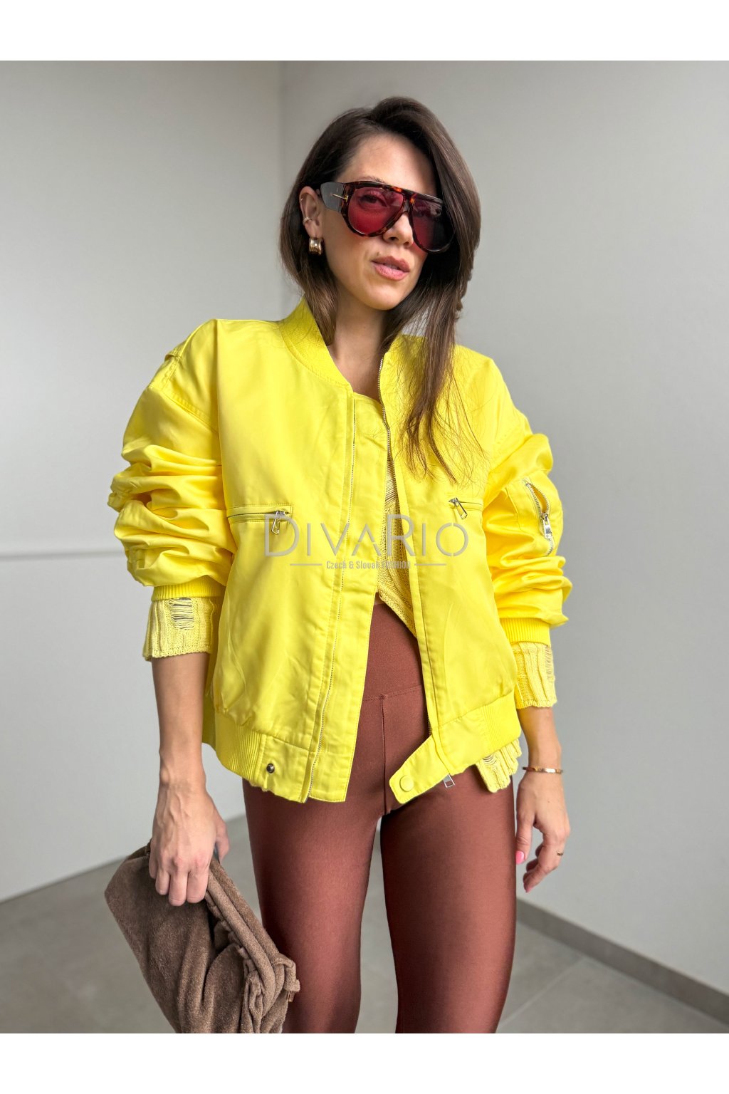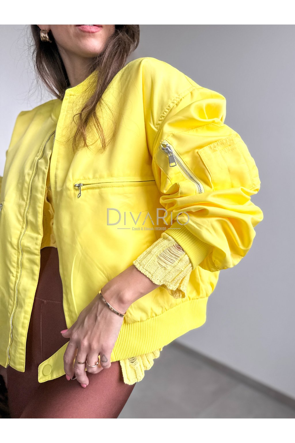 Oversize žltá bombera s dlhým rukávom, zapínanie na strieborný zips. Nazberkané rukávy.