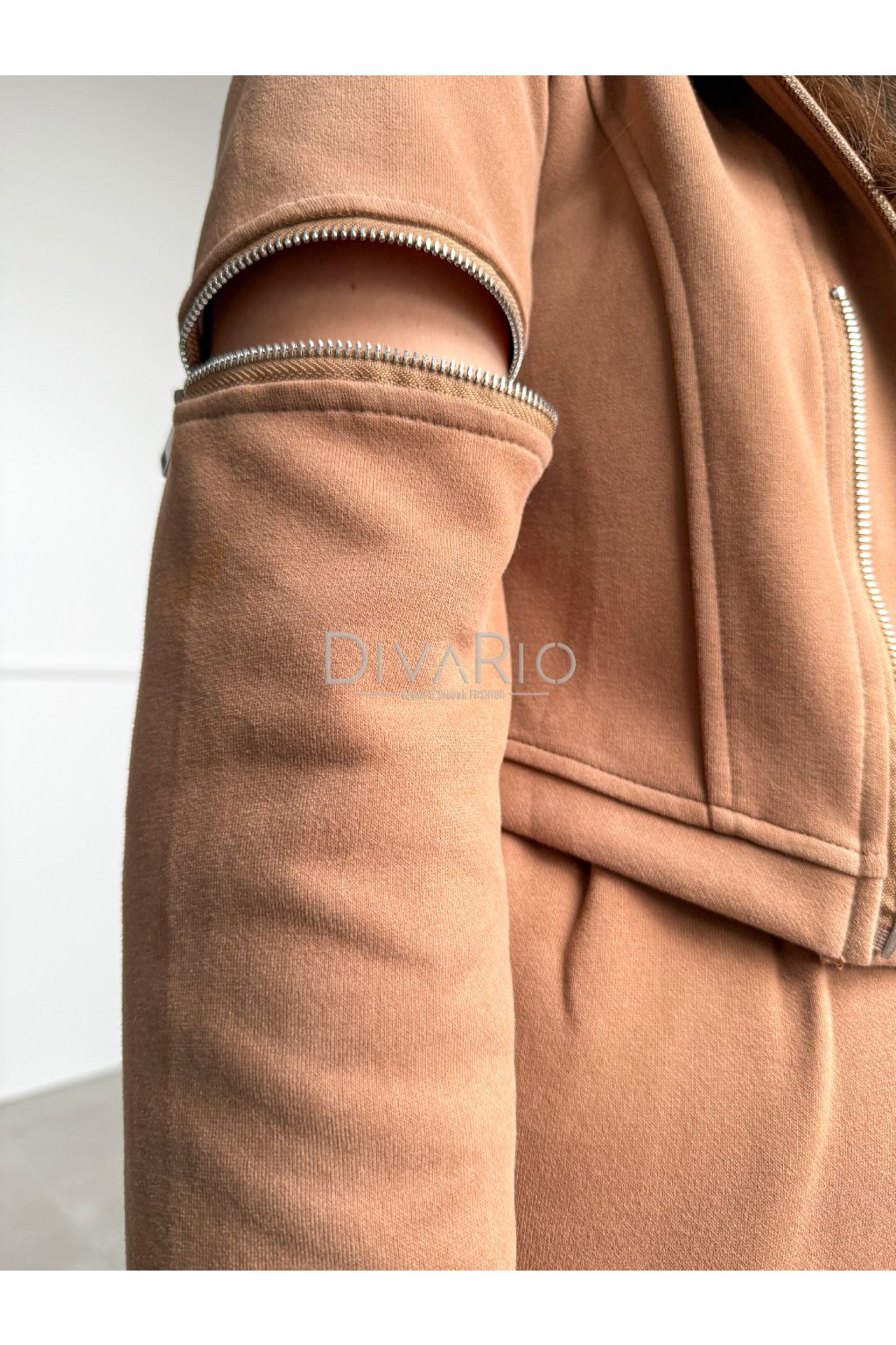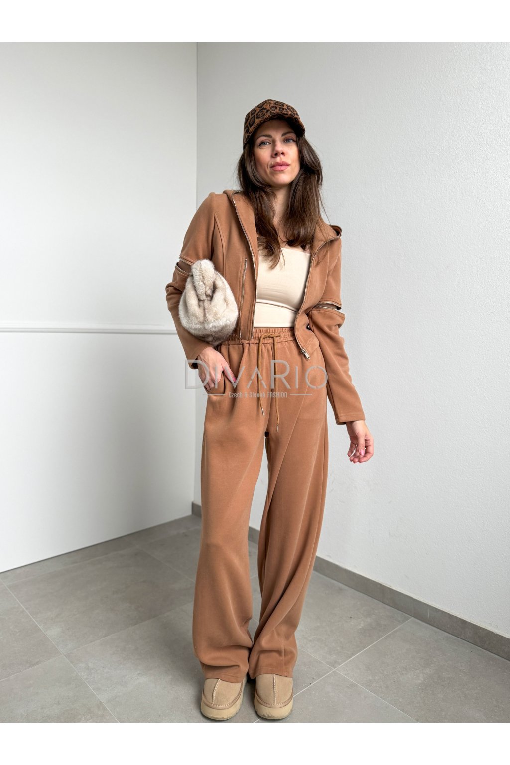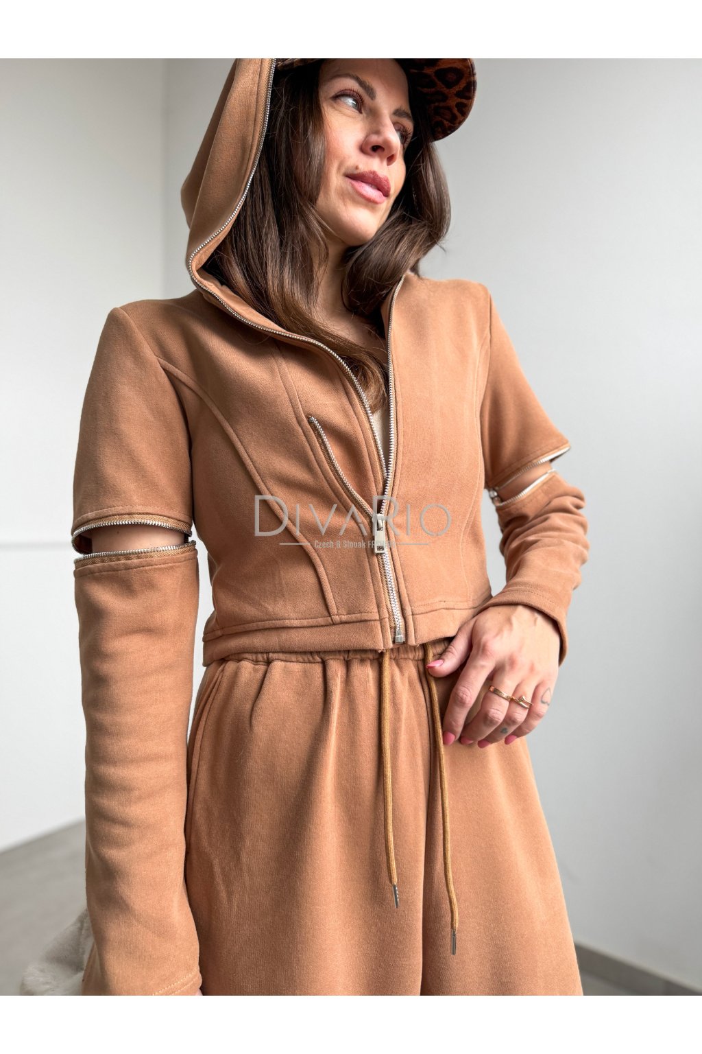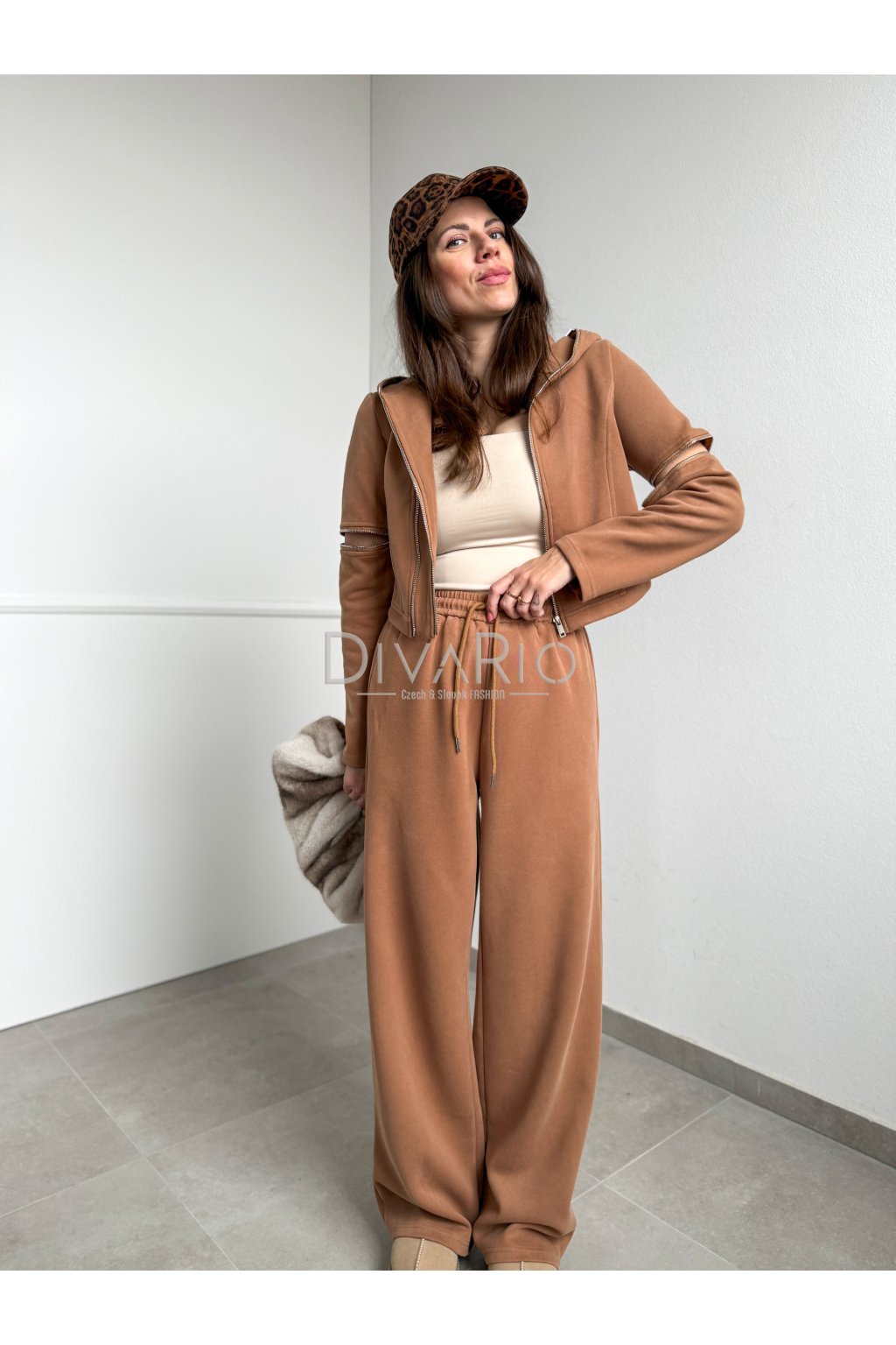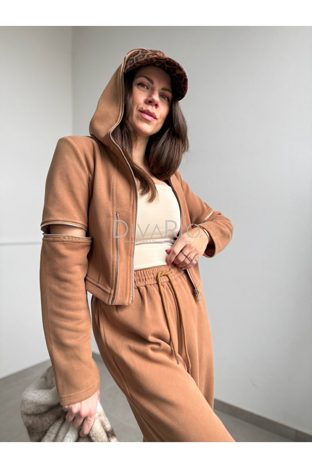 Set pozostáva zo širokých teplák, v pase je gumička a šnúrka, a skrátenej mikiny s dlhými rukavmi so zipsami na kaktoch v karamelovej hnedej farbe.