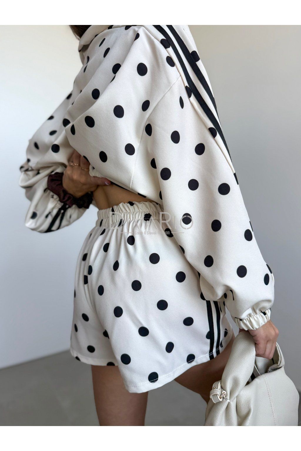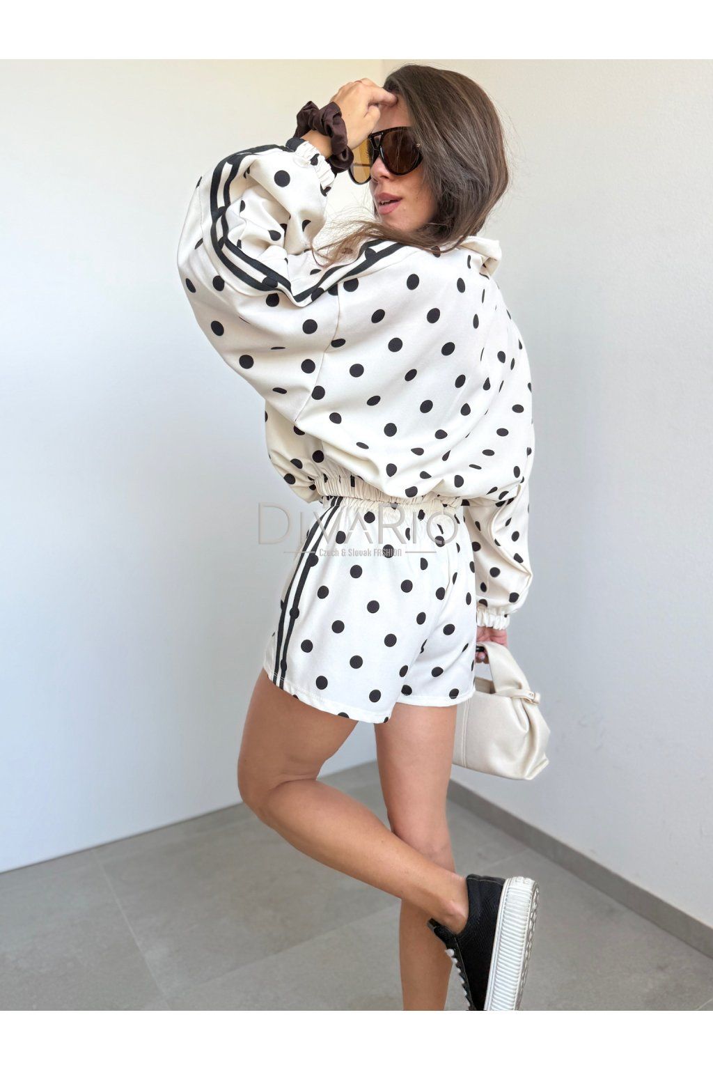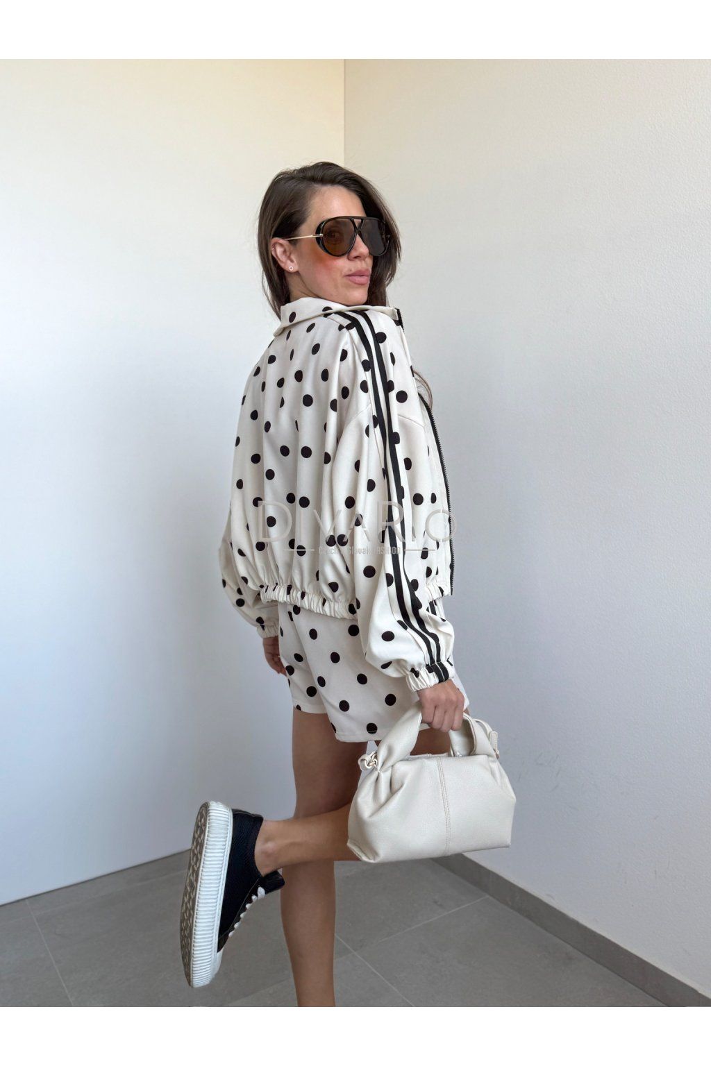 Krémový set s čiernými bodkami, set pozostáva z kraťas a bundy, zapínanie na zips, dlhý rukáv, vysoký pas. Bunda nie je futrovaná. Set sedí na veľkosti XS,S, menšie(nižšie M).