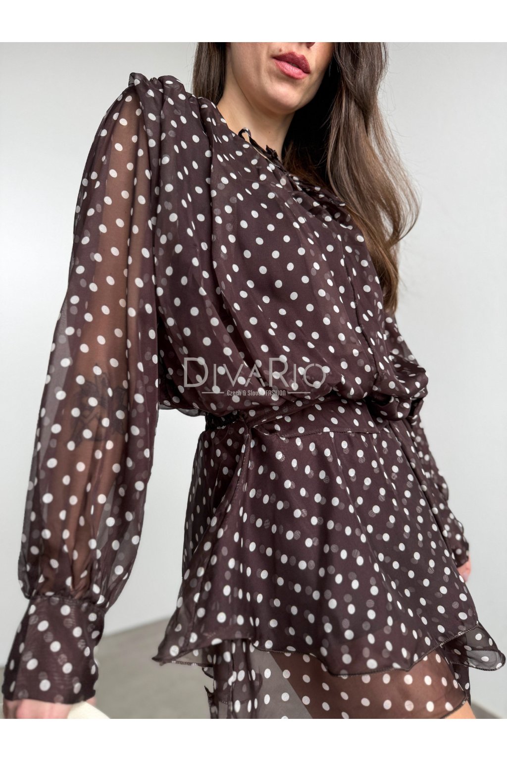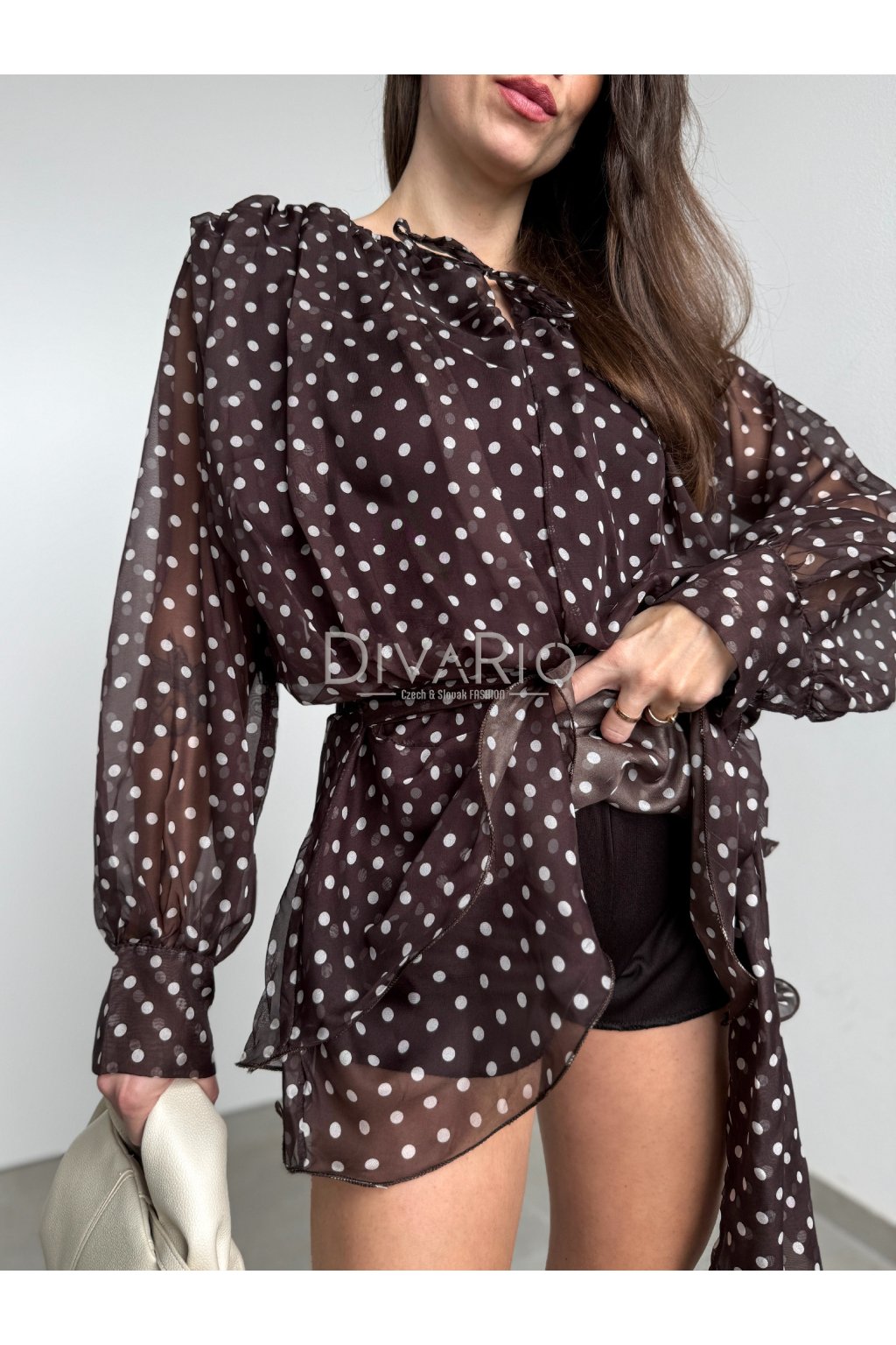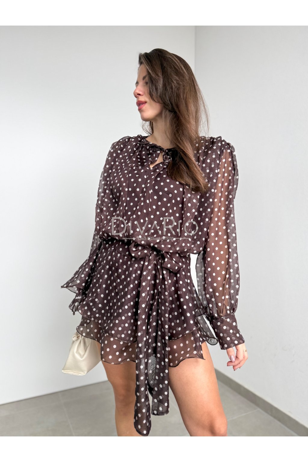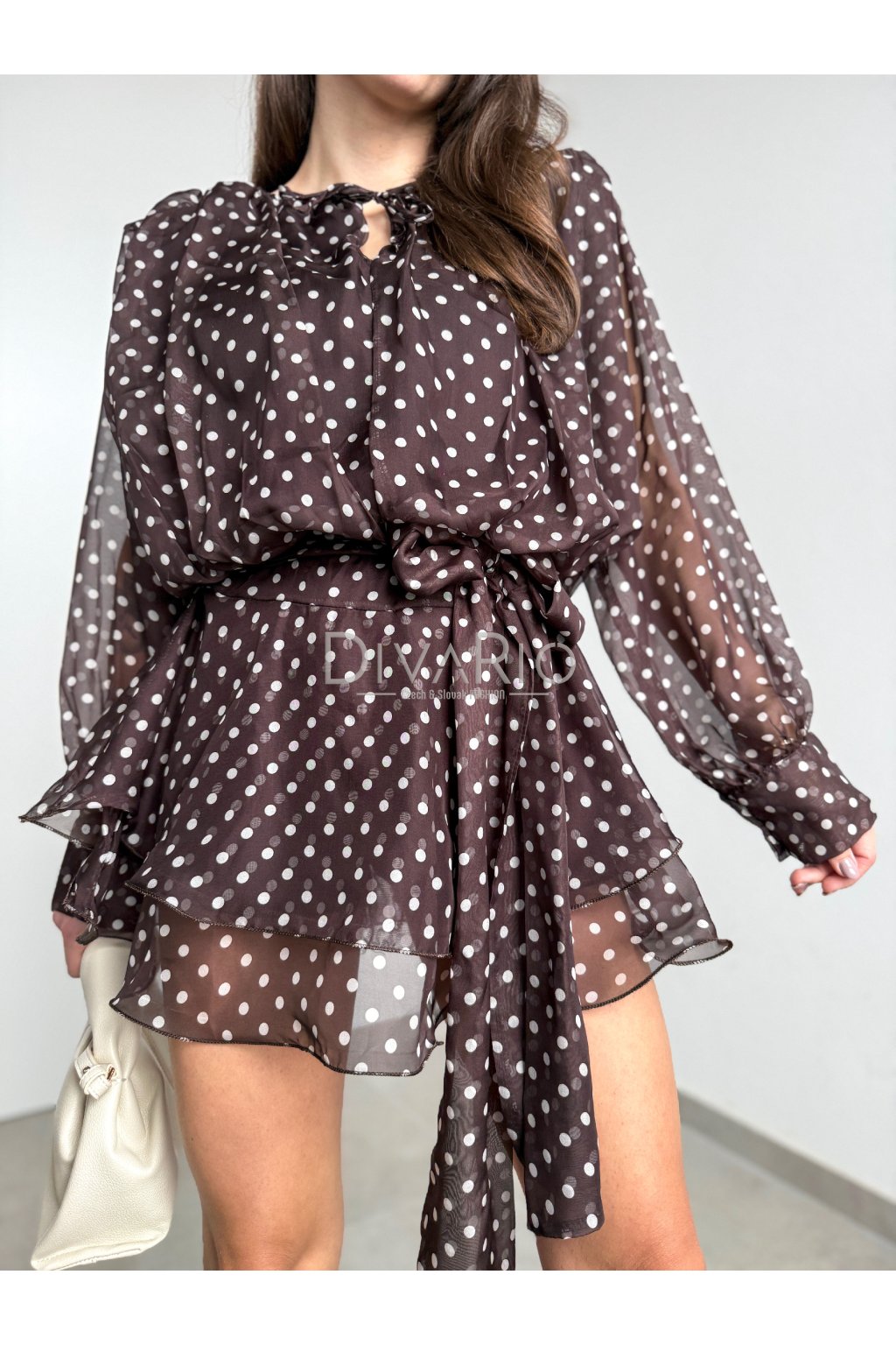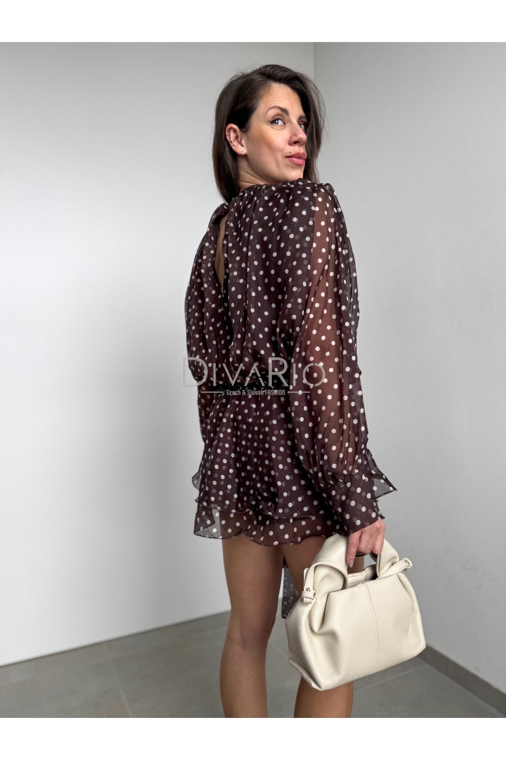 Overal v hnedej čokoládovej farbe s bielými bodkami, prestrihnutý v pase, viazanie na pase, zo zadu na pase gumička, dlhý priesvitný rukáv. Kraťasová spodnička v rovnakej farbe. Vhodné pre max 170 cm.