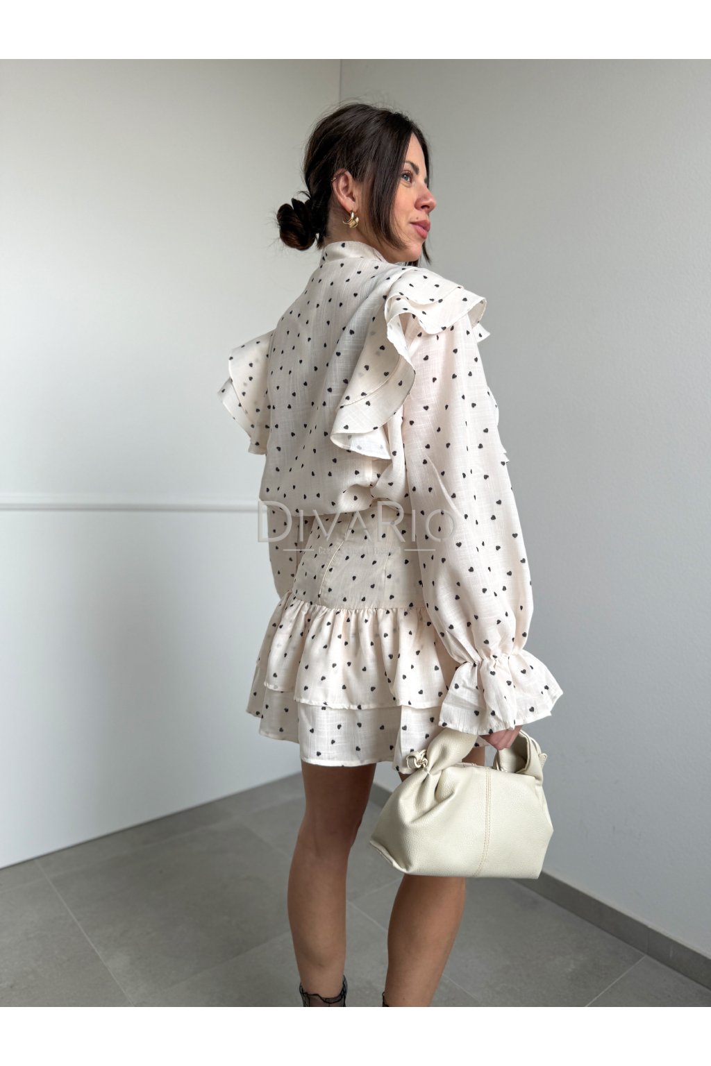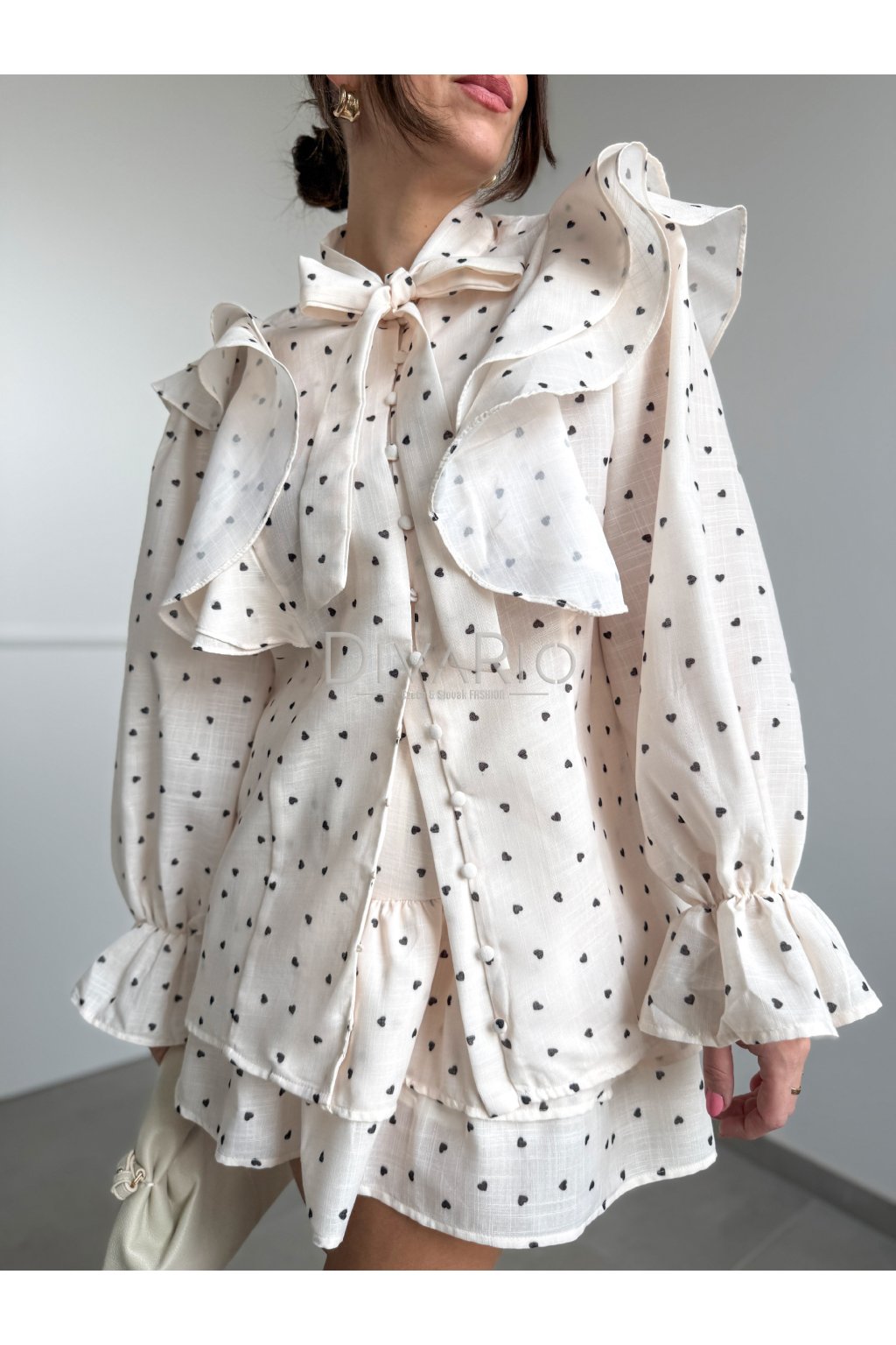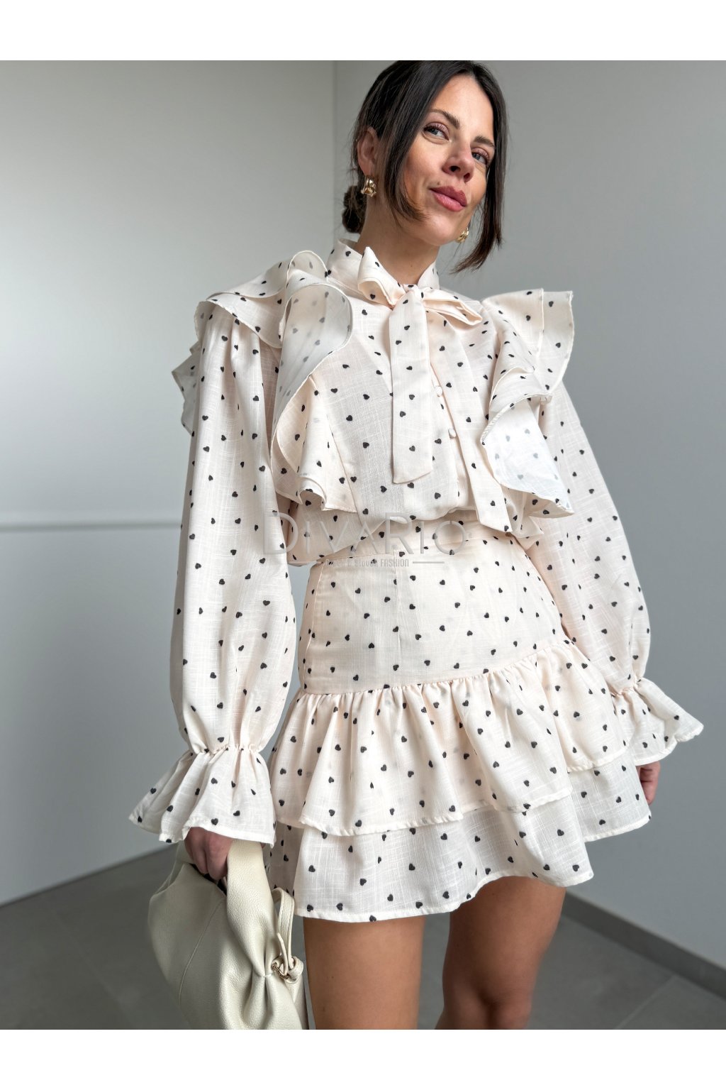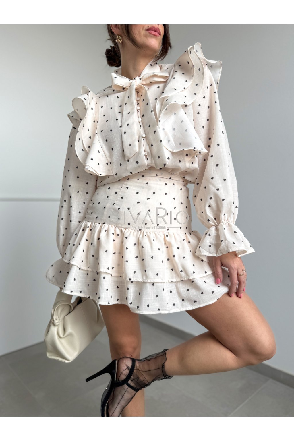 Elegantný set pozostáva z krátkej sukne a blúzky, jemný bežová farba s čiernymi srdiečkami. Top kvalita. Zapínanie na gombíky a viazanie pod krkom. Sukňa má kraťasovú spodničku, vysoký pas, zapínanie na zips. .
