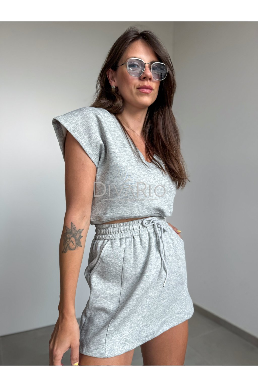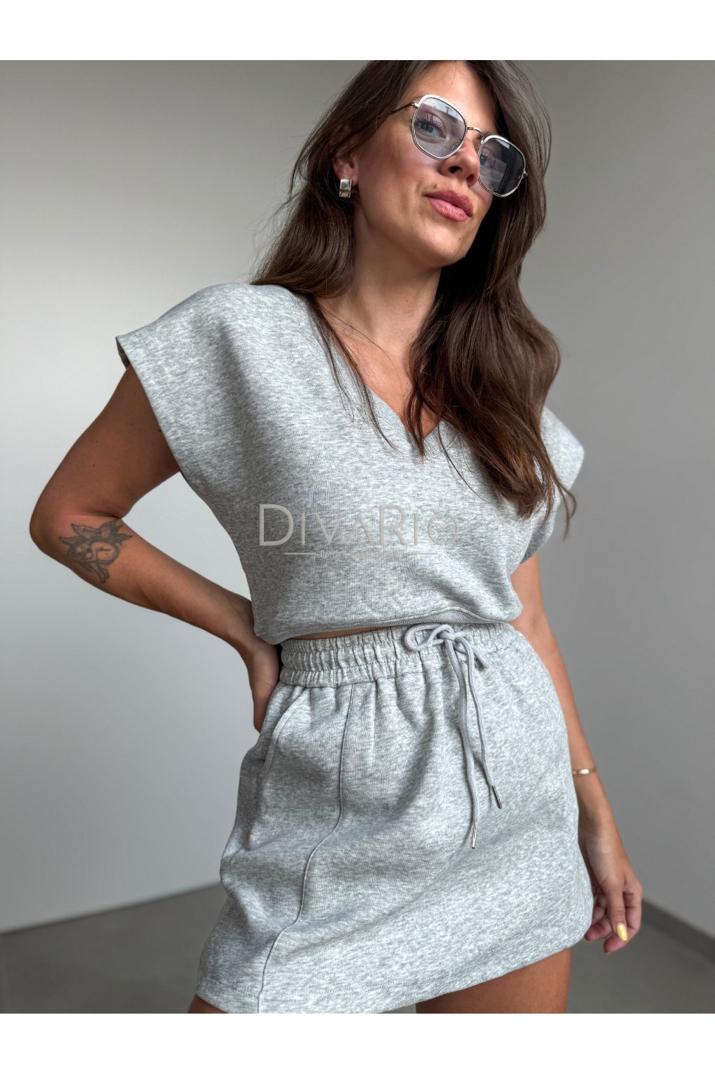 Šedý teplákový set zložený zo sukne s kraťasovou spodničkou a s krátkou mikinou s krátkym rukávom. V pase gumička.
