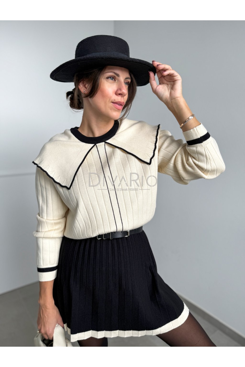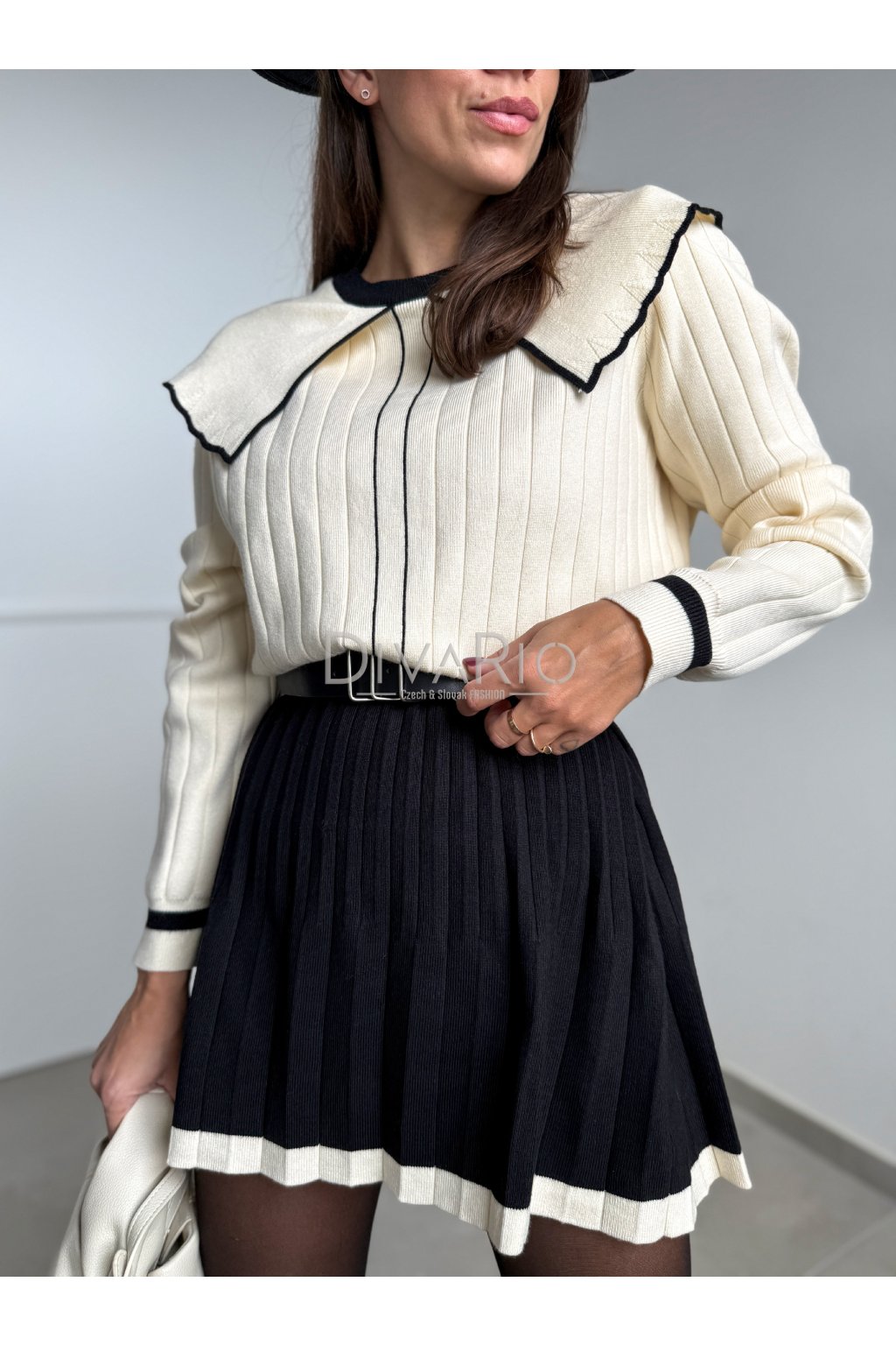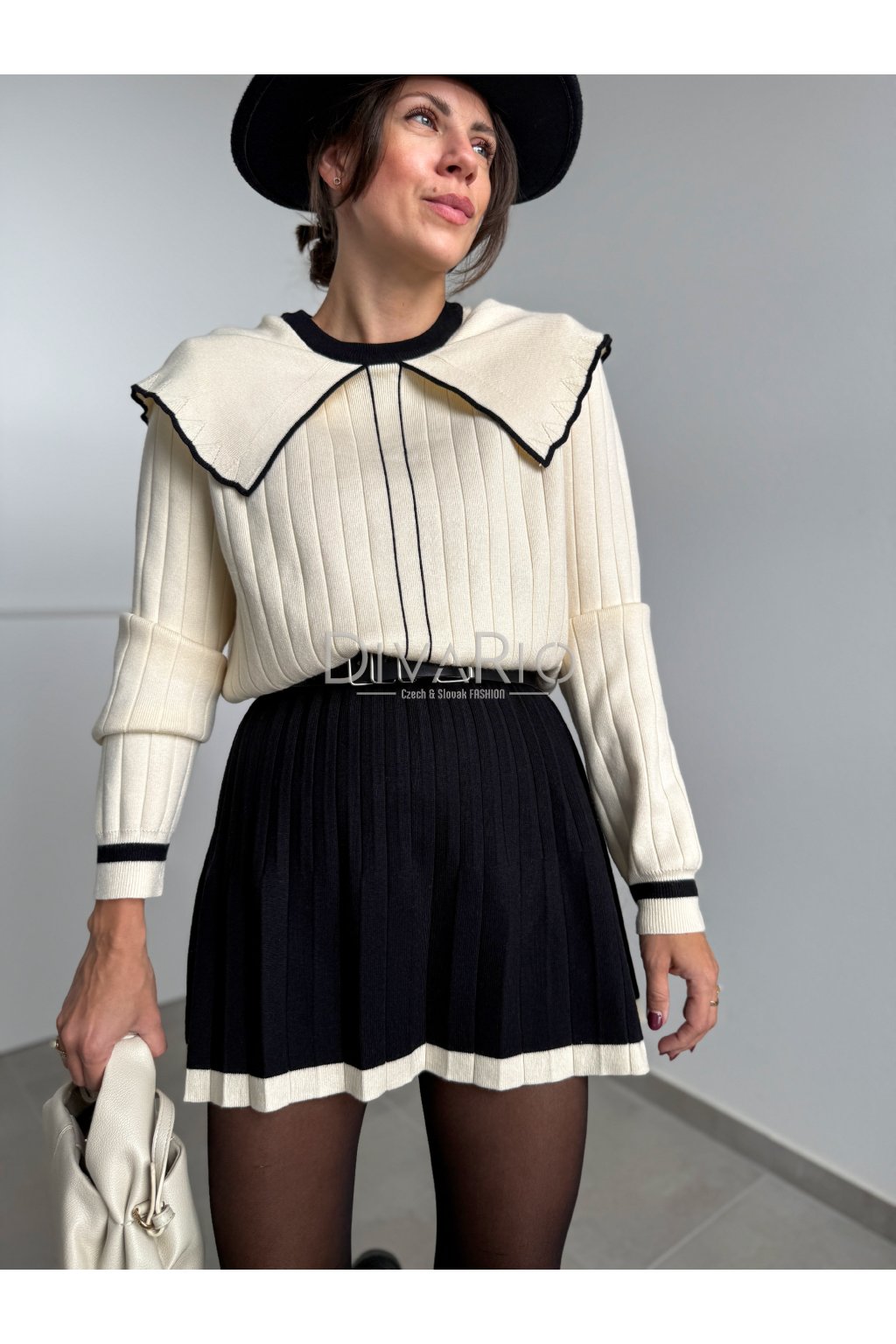 Kmitový sukňový set v kremovo čiernej kombinácií. Sukňa je vhodná aj pre vyššiu postavu sedí od S po L. Šrší pas, vhodné spevniť opaskom. Áčková plisovaná sukňa, svetrík so širšími rukávmi, krásny dominantný golier. Elastický materiál.