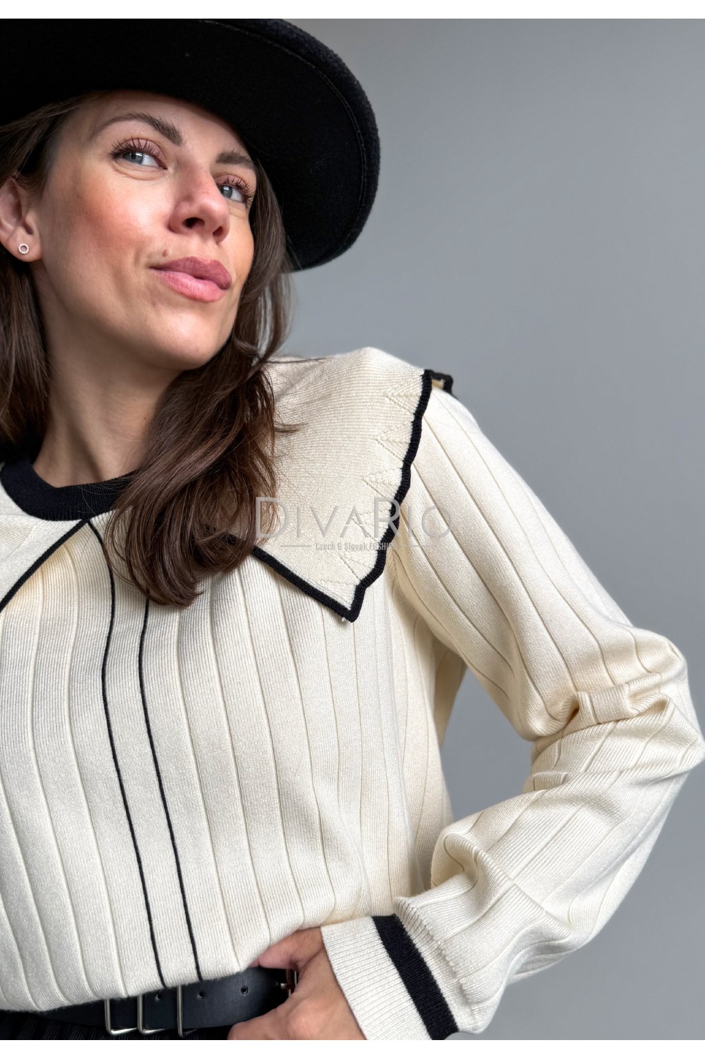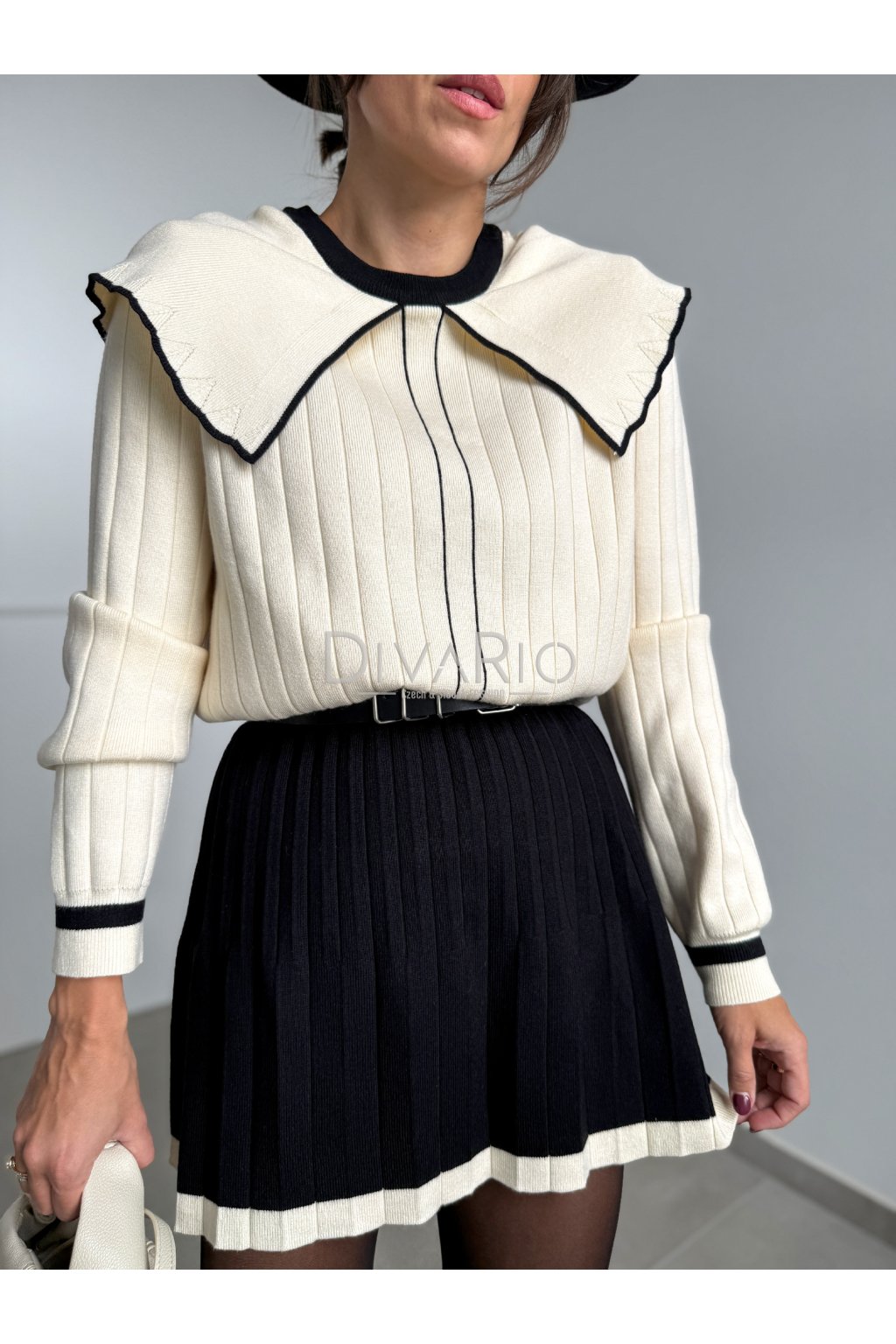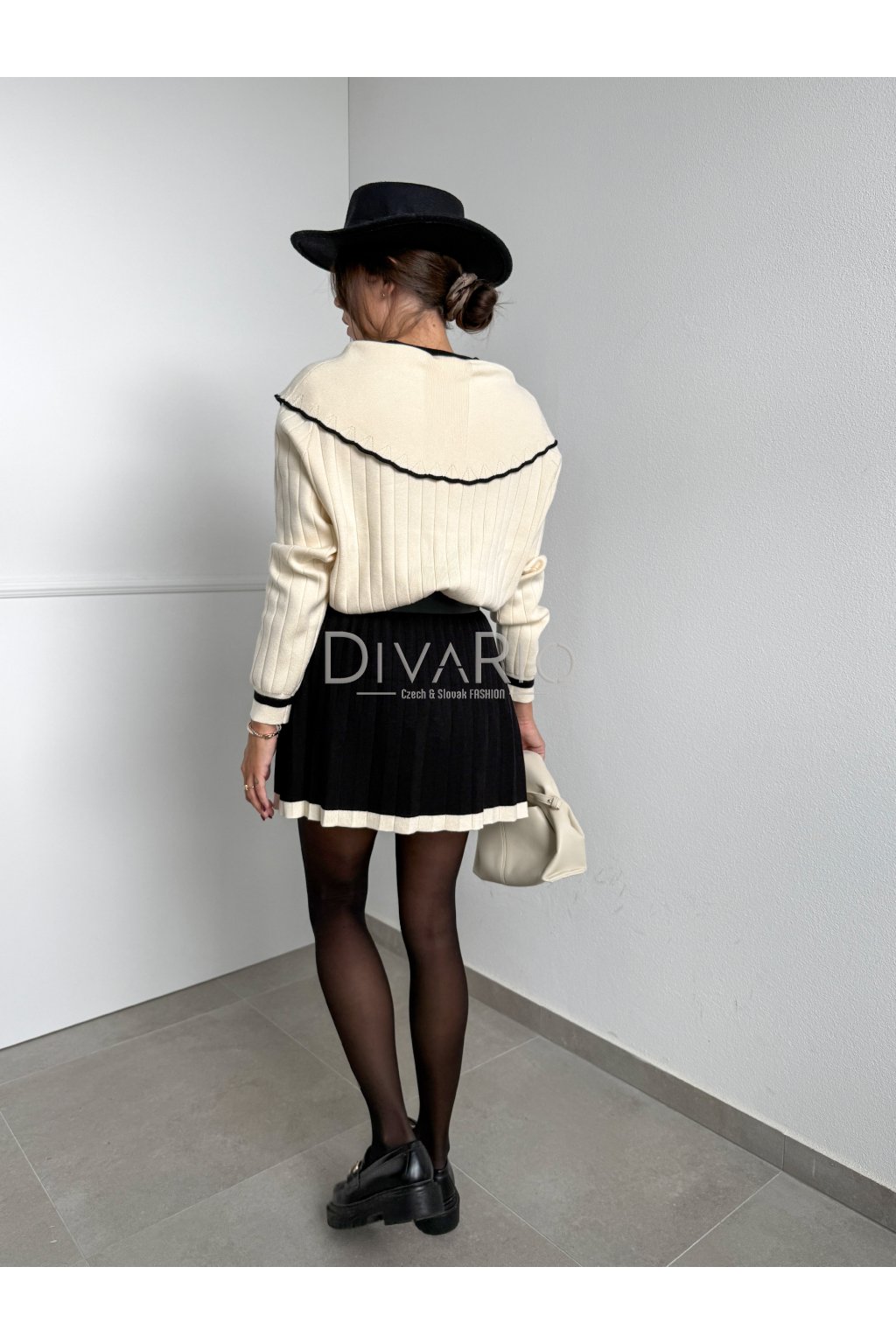 Kmitový sukňový set v kremovo čiernej kombinácií. Sukňa je vhodná aj pre vyššiu postavu sedí od S po L. Šrší pas, vhodné spevniť opaskom. Áčková plisovaná sukňa, svetrík so širšími rukávmi, krásny dominantný golier. Elastický materiál.