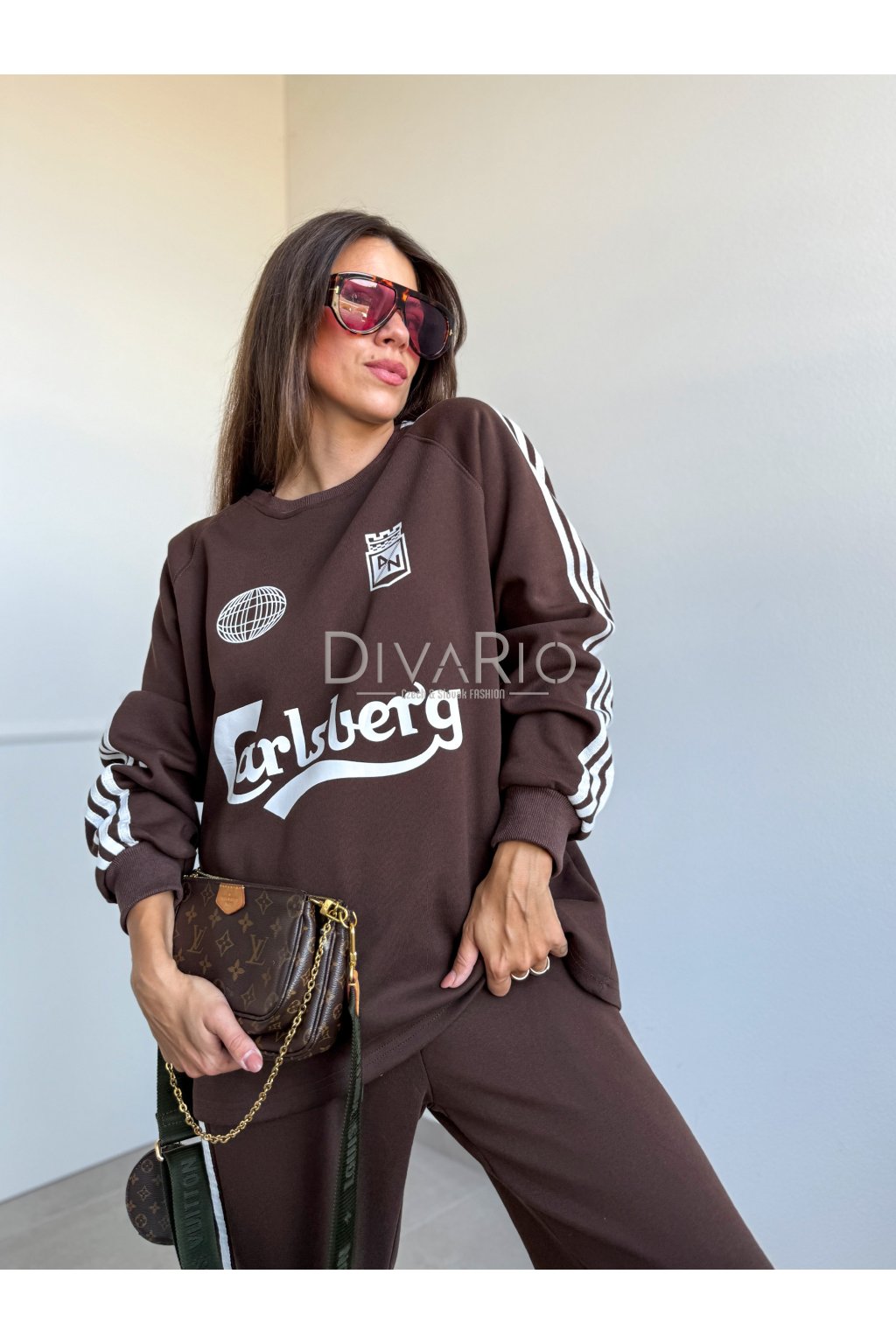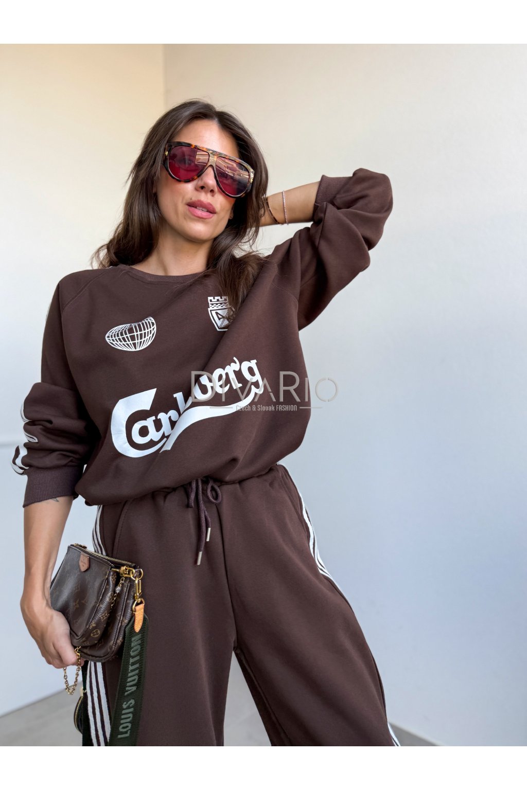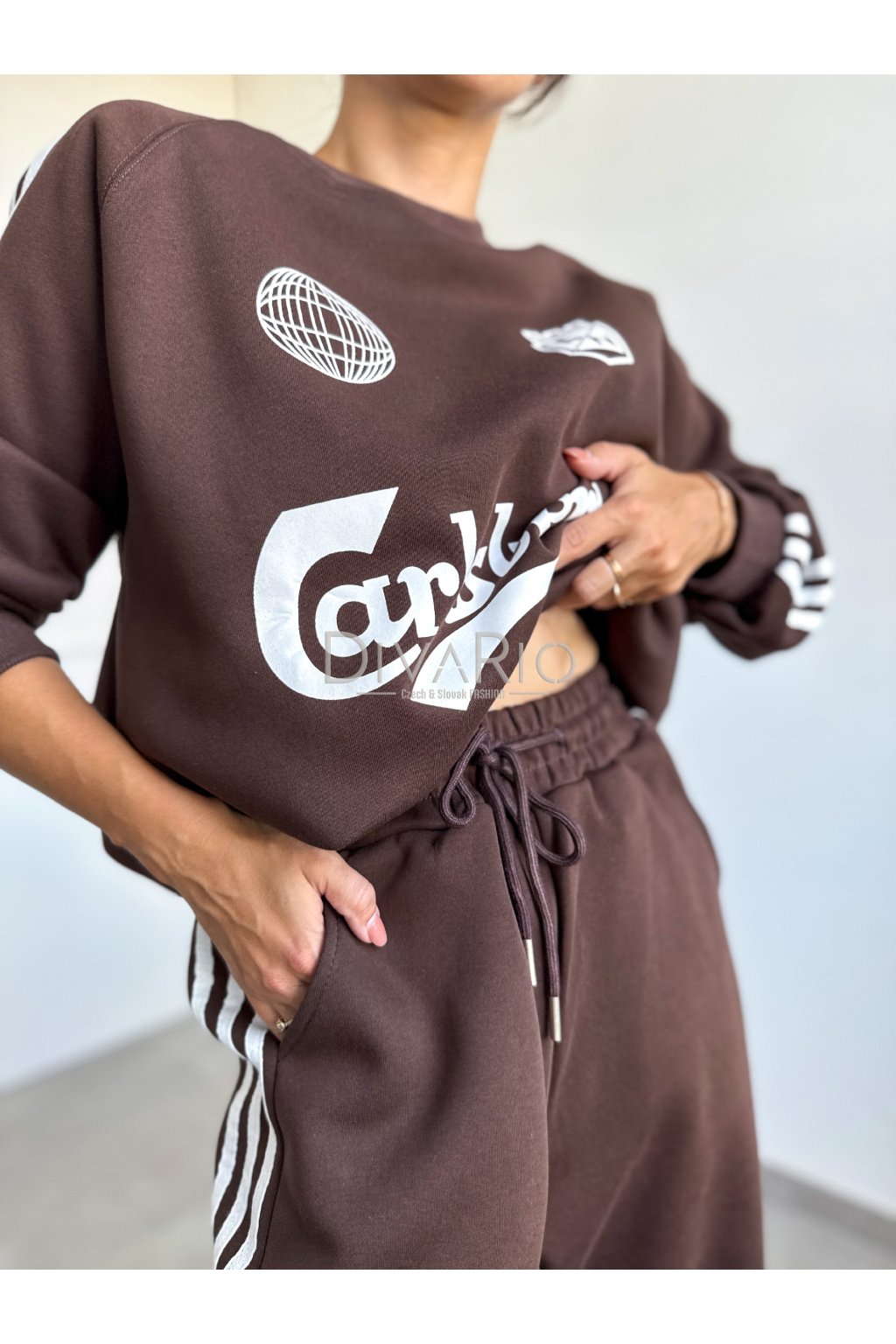 Teplákový set v tmavo hnedej farbe, dlhý rukáv, široké tepláky, v pase gumička.