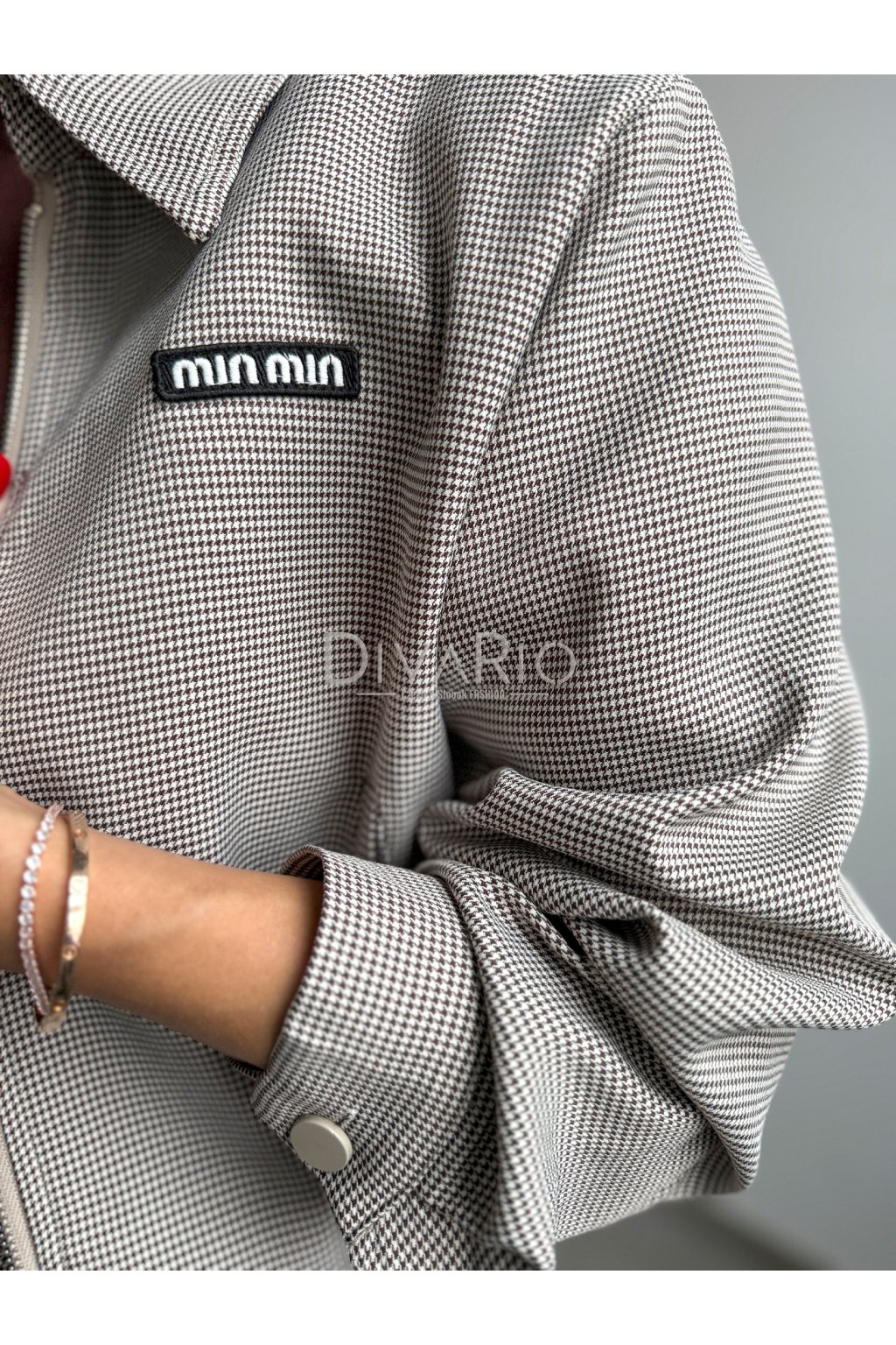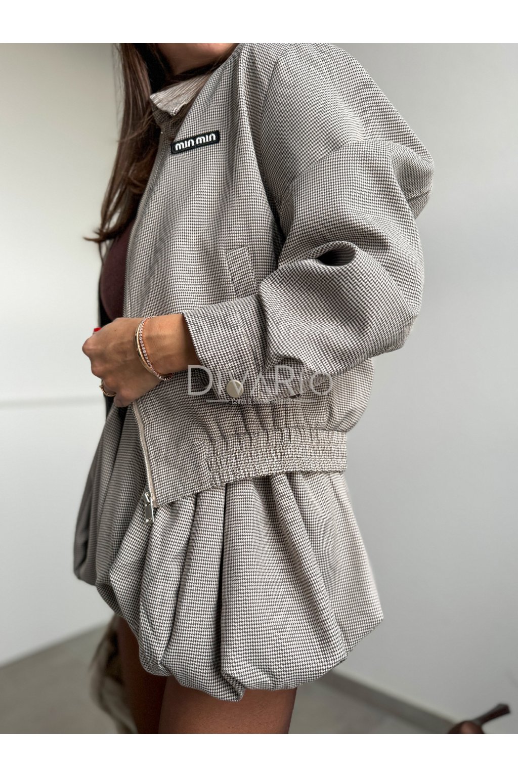Set pozostáva z krátkych balónových kraťas a bomberky v jemnom hnedo bežovom vzore. Nápis MIN MIN. Dlhý rukáv, zapínanie bundy na zips, top kvalita. Sukňa má v pase gumičku.
