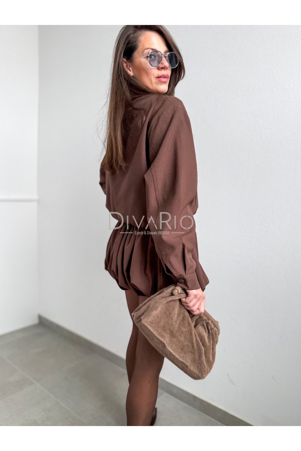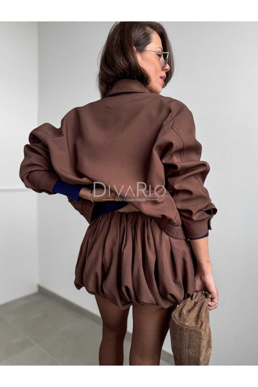 Set pozostáva z krátkych balónových kraťas a bomberky v tmavo hnedej čokoládovej farbe. Nápis MIN MIN. Dlhý rukáv, zapínanie bundy na zips, top kvalita. Sukňa má v pase gumičku.