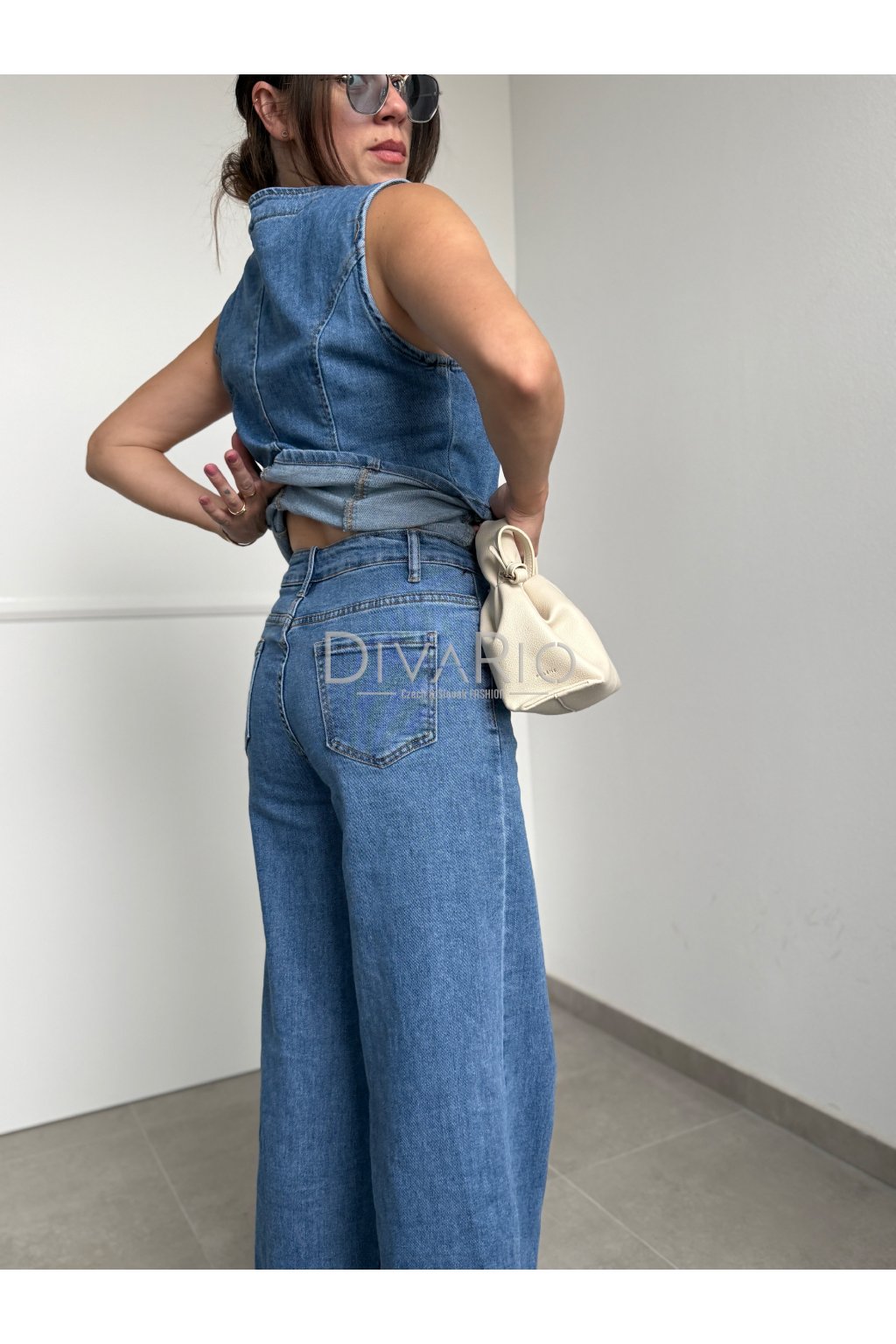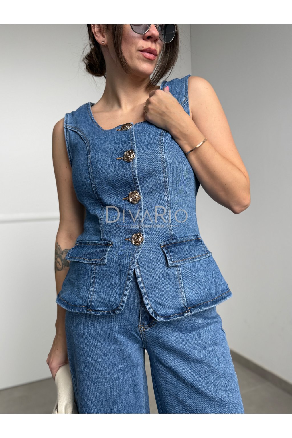 Rifľový vestový set, rifle a vesta so zlatými gombíkmi. rifle majú voľnejší strih, aj v pase, pohodlná mäkká džínsovina.